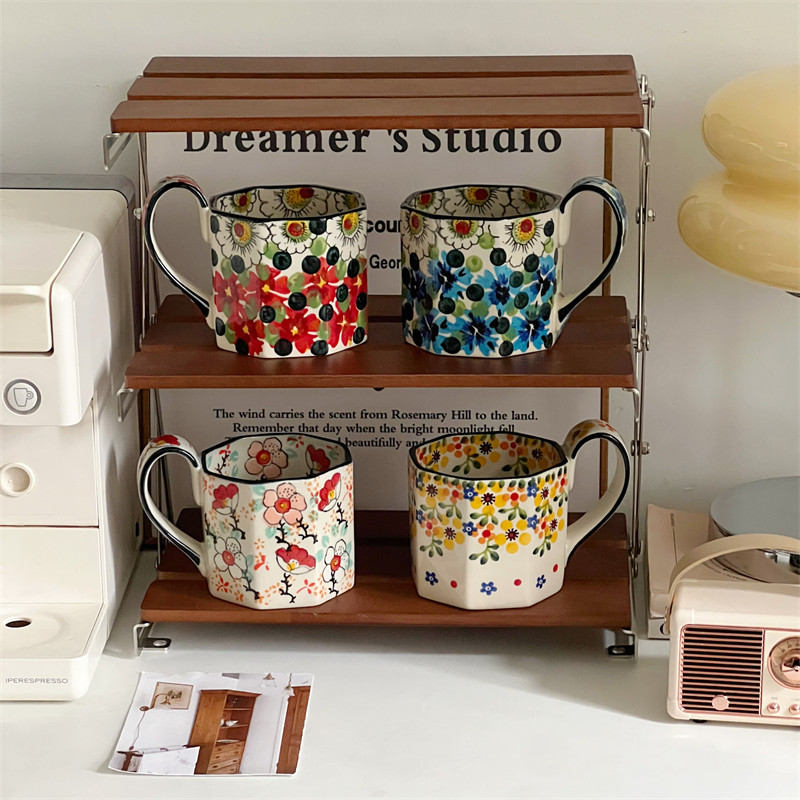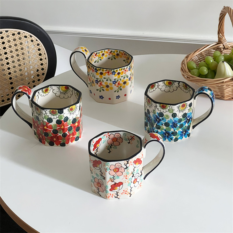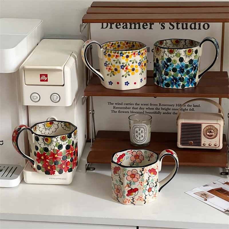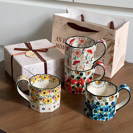 釉下彩水彩画马克杯大容量小众设计感八角咖啡杯女士复古杯子礼物