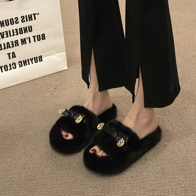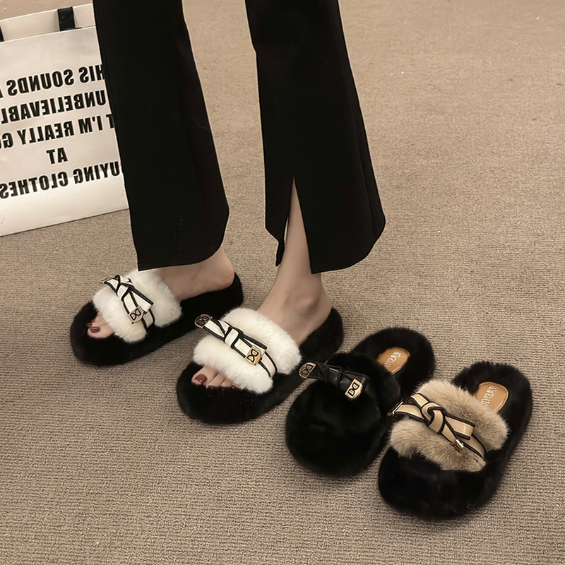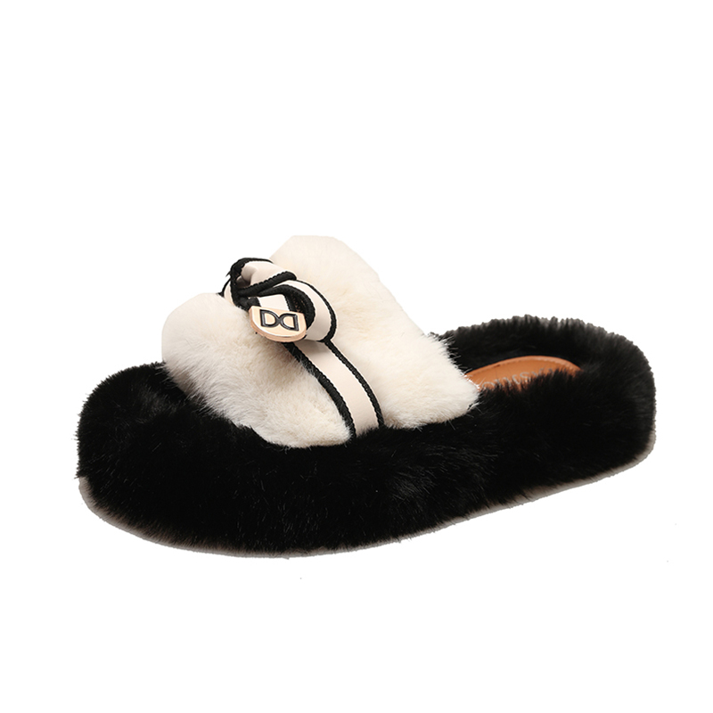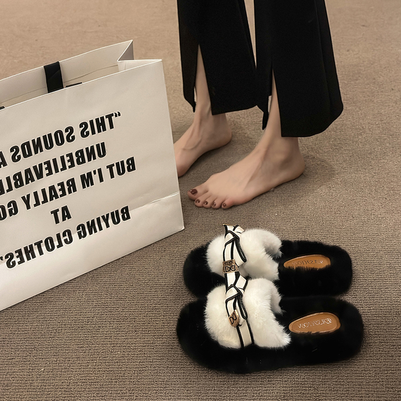毛毛拖鞋女外穿2025新款秋冬季白色兔毛毛鞋系带鞋松糕厚底棉拖鞋