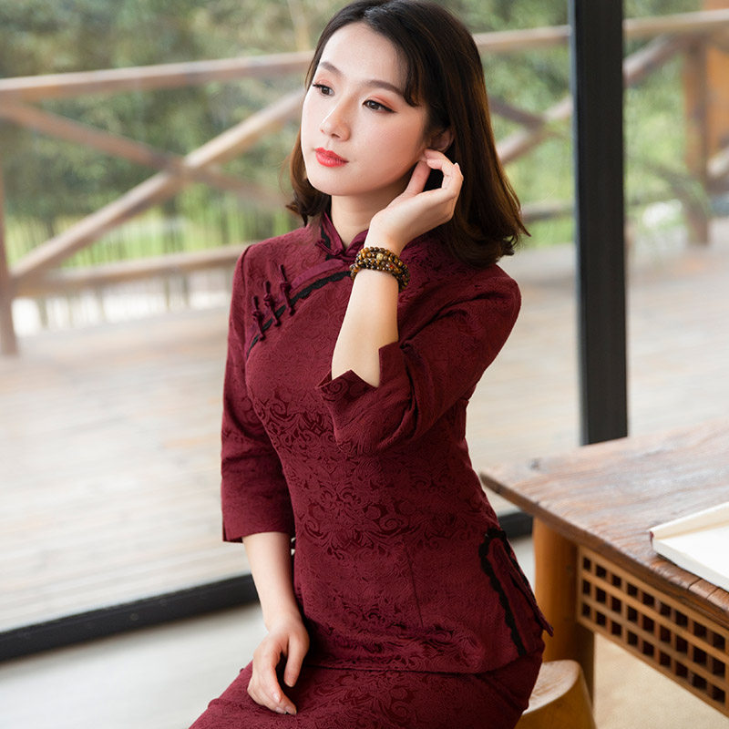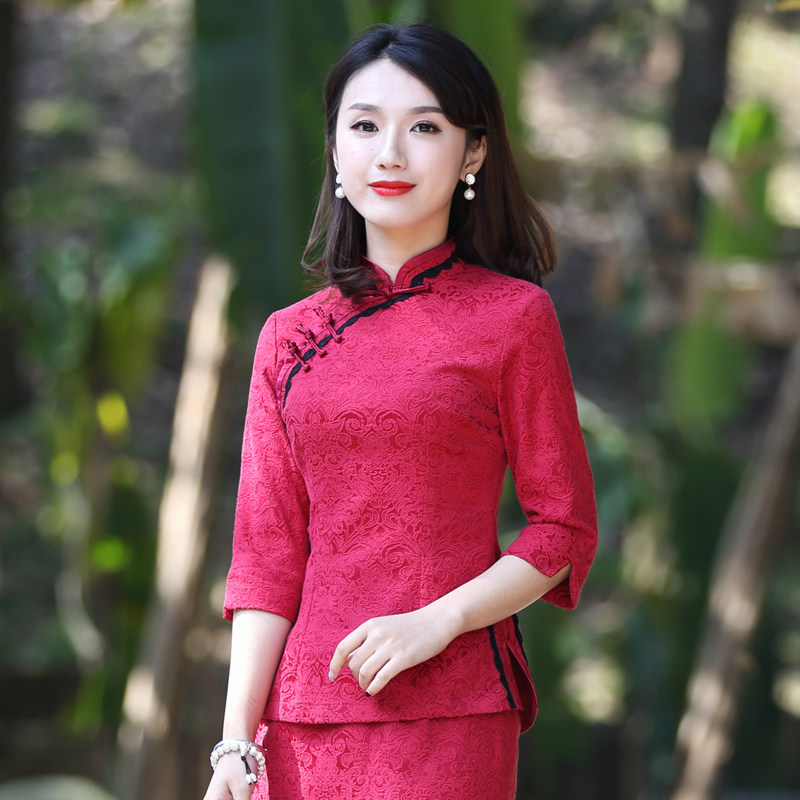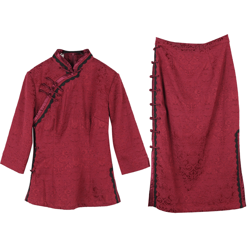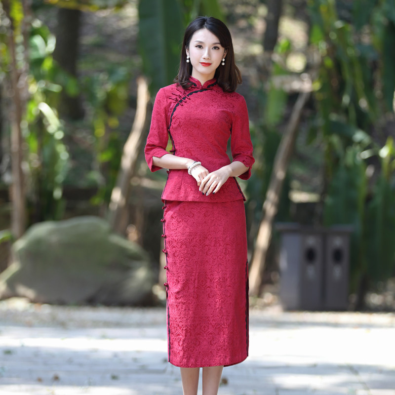 筠雅套装女秋冬红色休闲时尚气质名媛新中式复古改良旗袍裙两件套