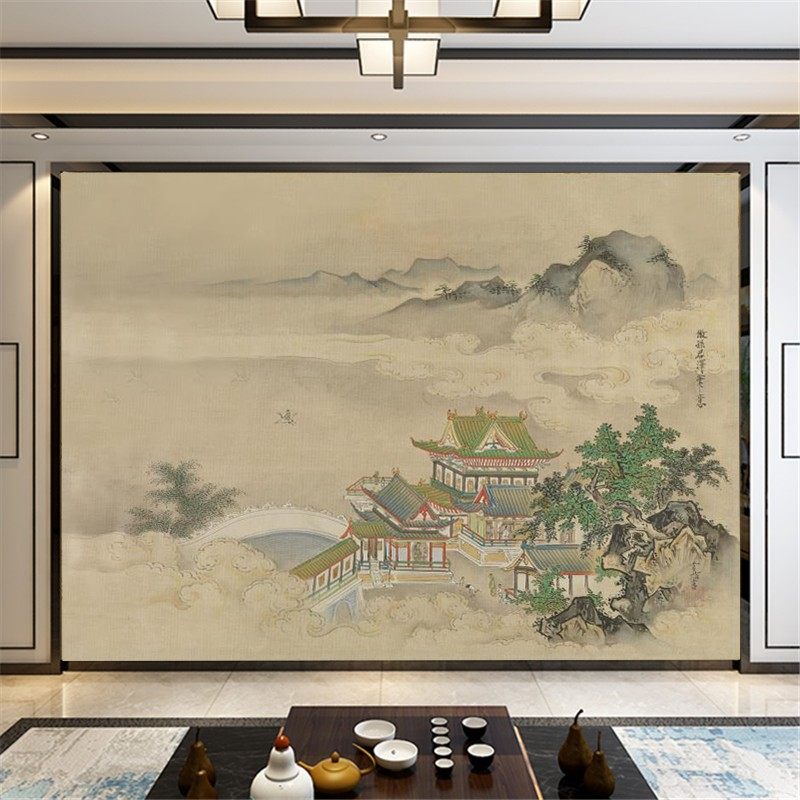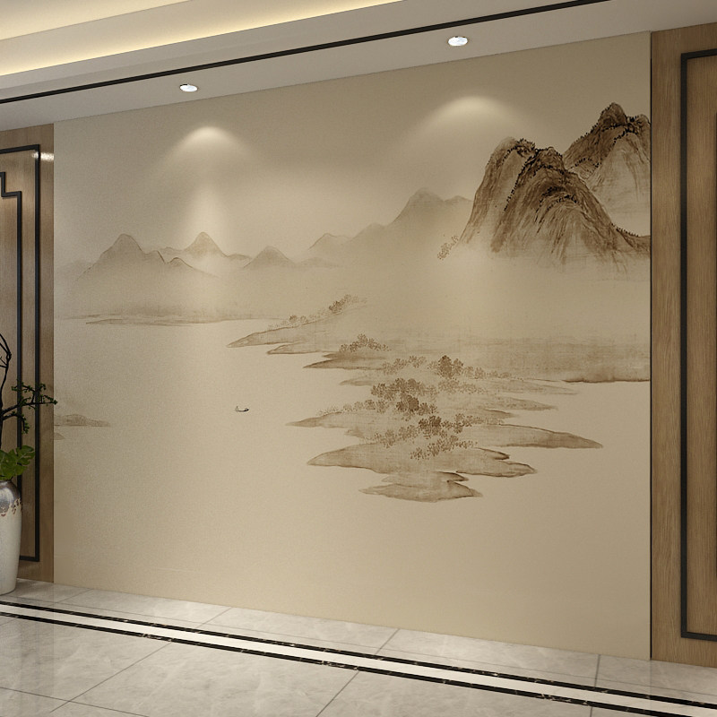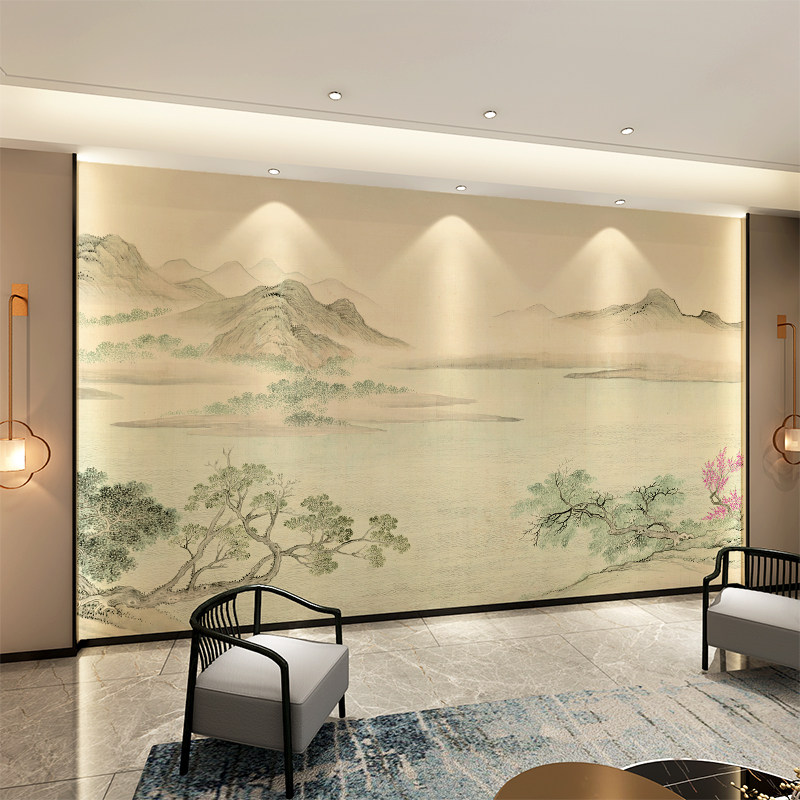 中式电视背景墙壁纸山水画壁画餐厅民宿卧室墙布禅意茶室饭店墙纸