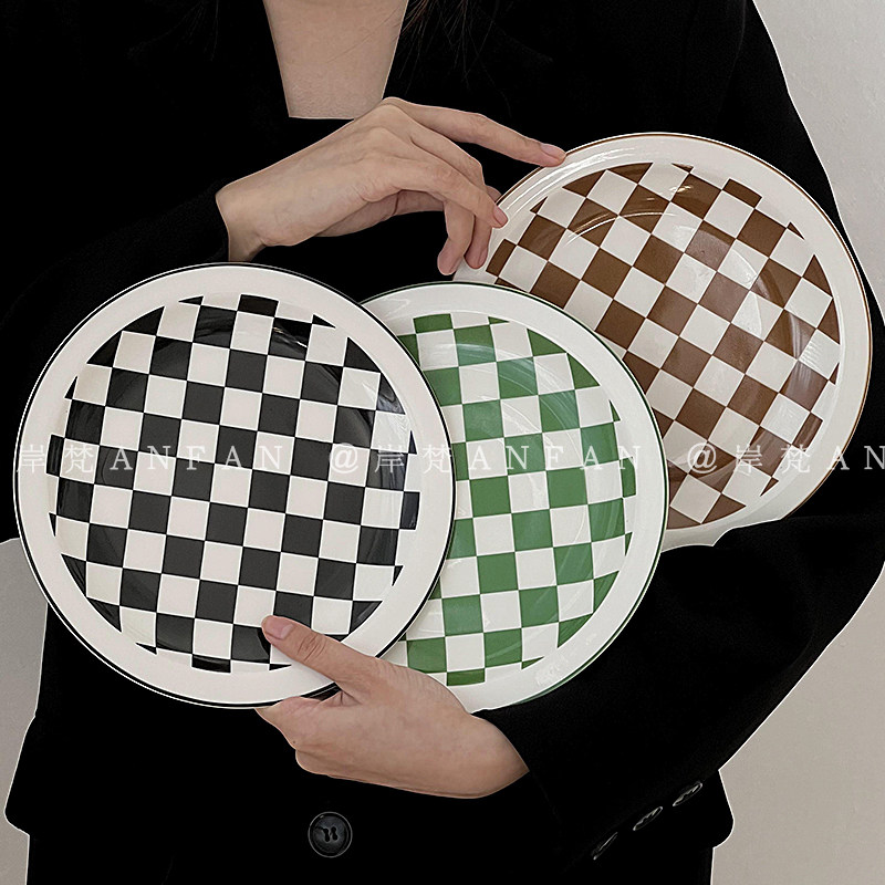 岸梵*创意小众棋盘格陶瓷杯盘简约日常家用平盘托盘果盘高颜值