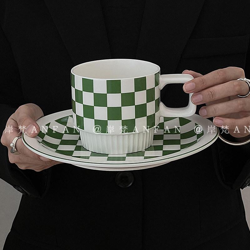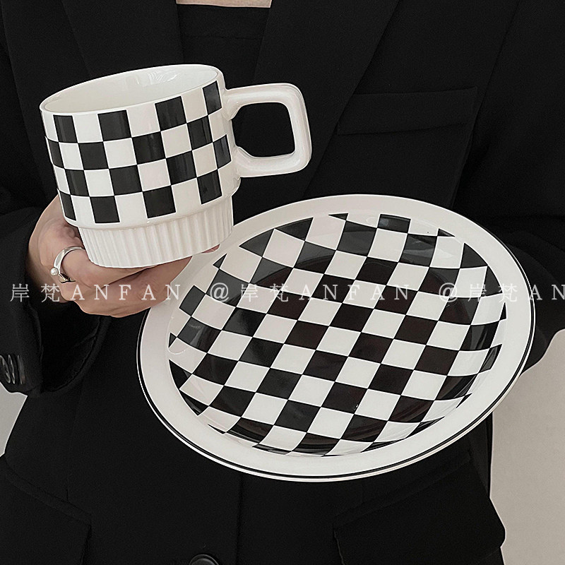 岸梵创意小众棋盘格陶瓷杯盘