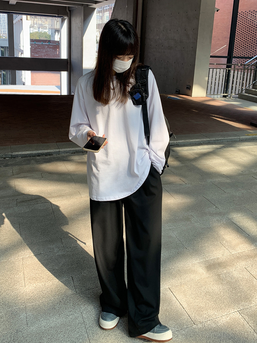 SIXI四喜家春季 简约白色长袖T恤女宽松圆领叠穿内搭打底衫上衣