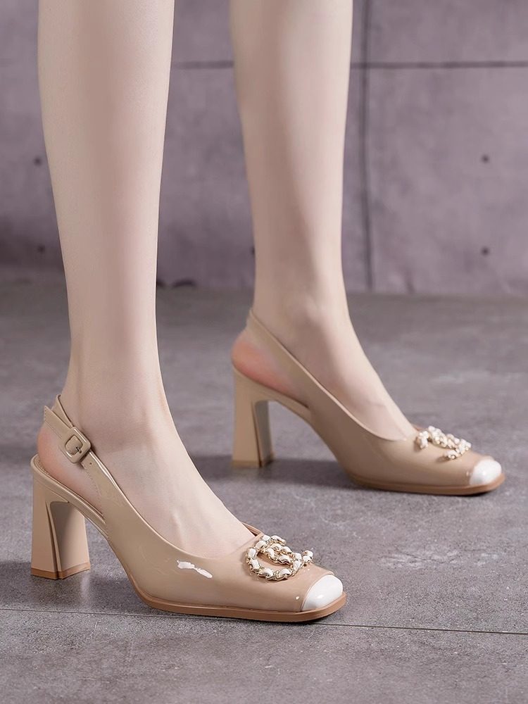 拼接法式高跟鞋女2025新款后空一字扣春夏季方头粗跟单鞋气质名媛
