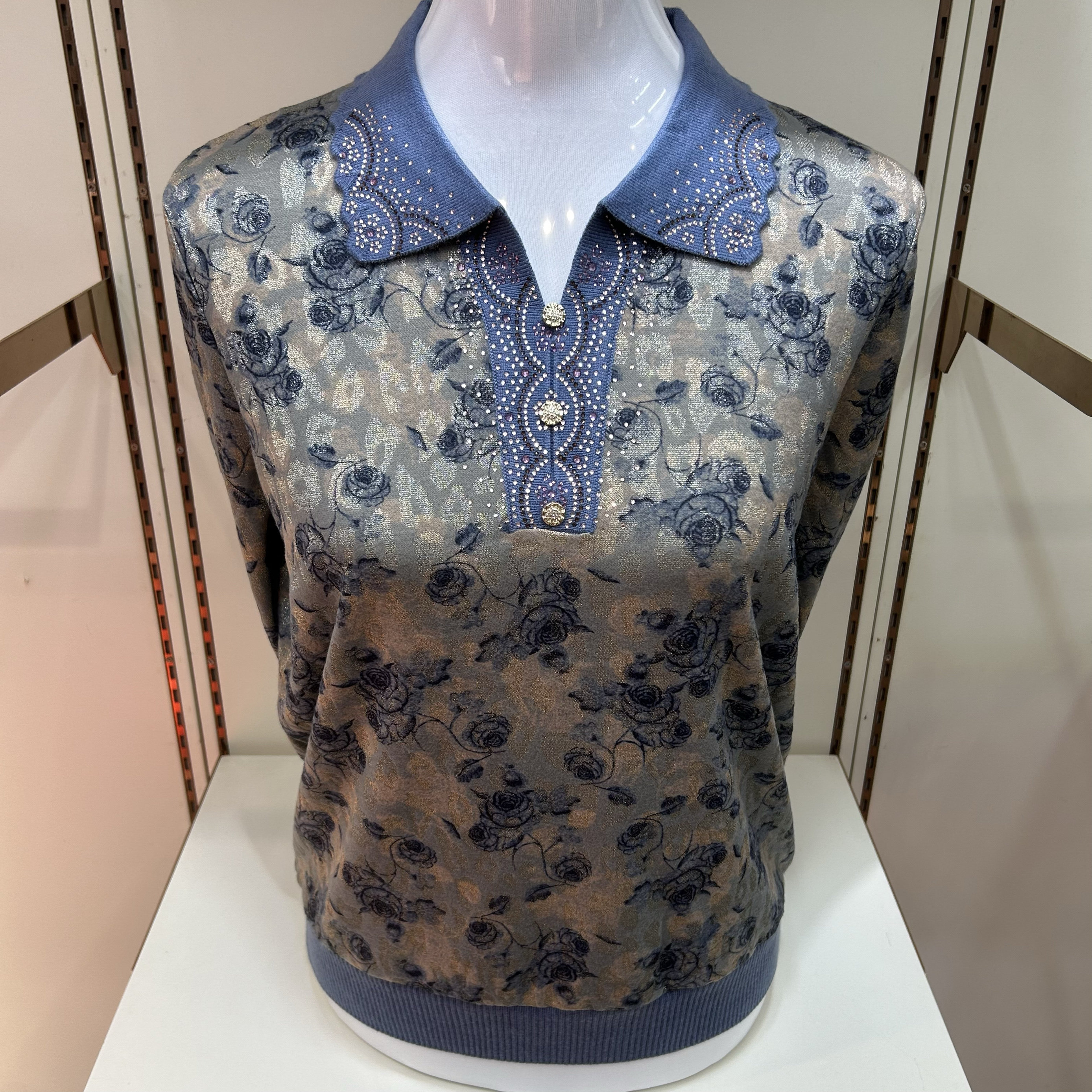 艾靓依带钻翻领T恤衫妈妈装秋衣薄款提花布料打底衫老人长袖上衣