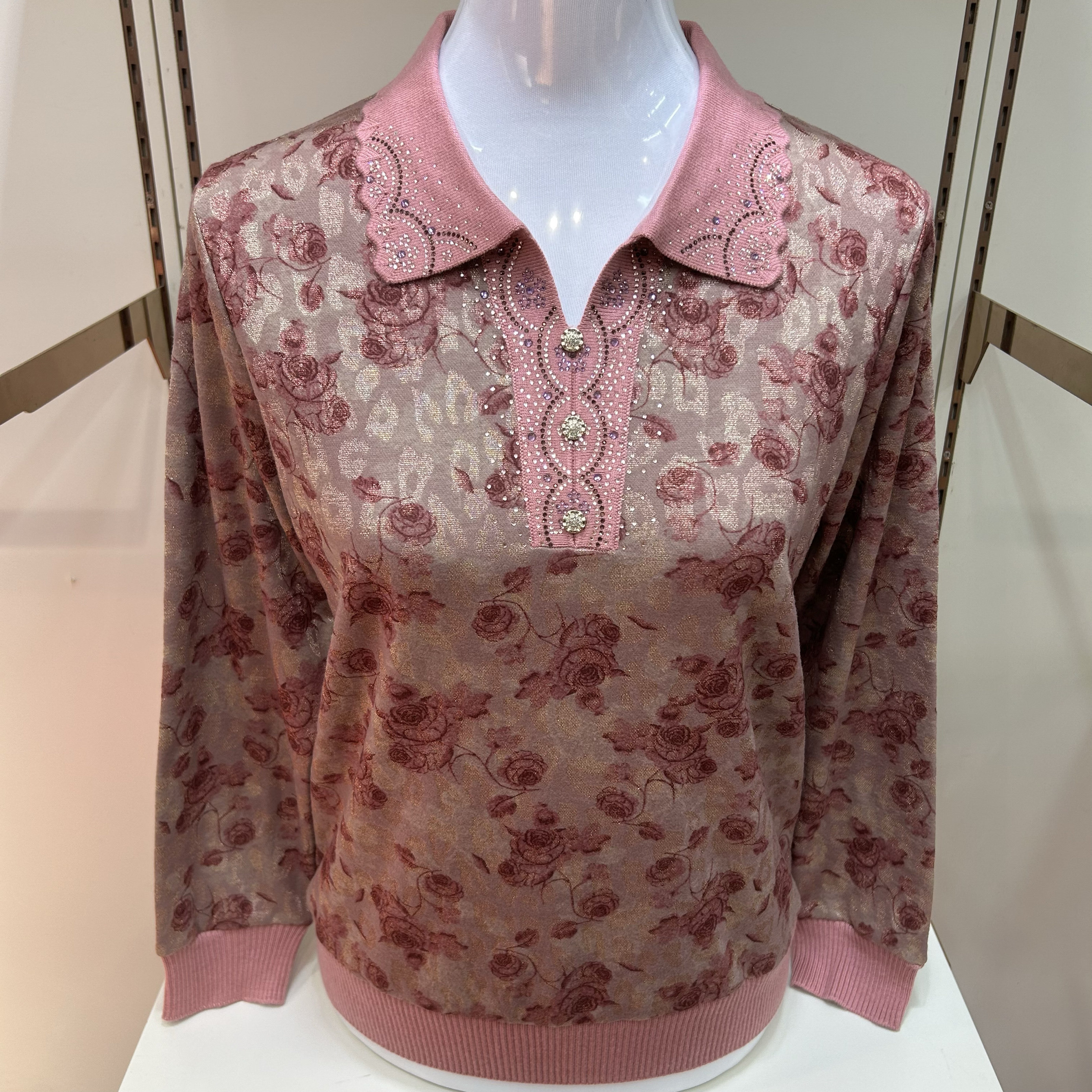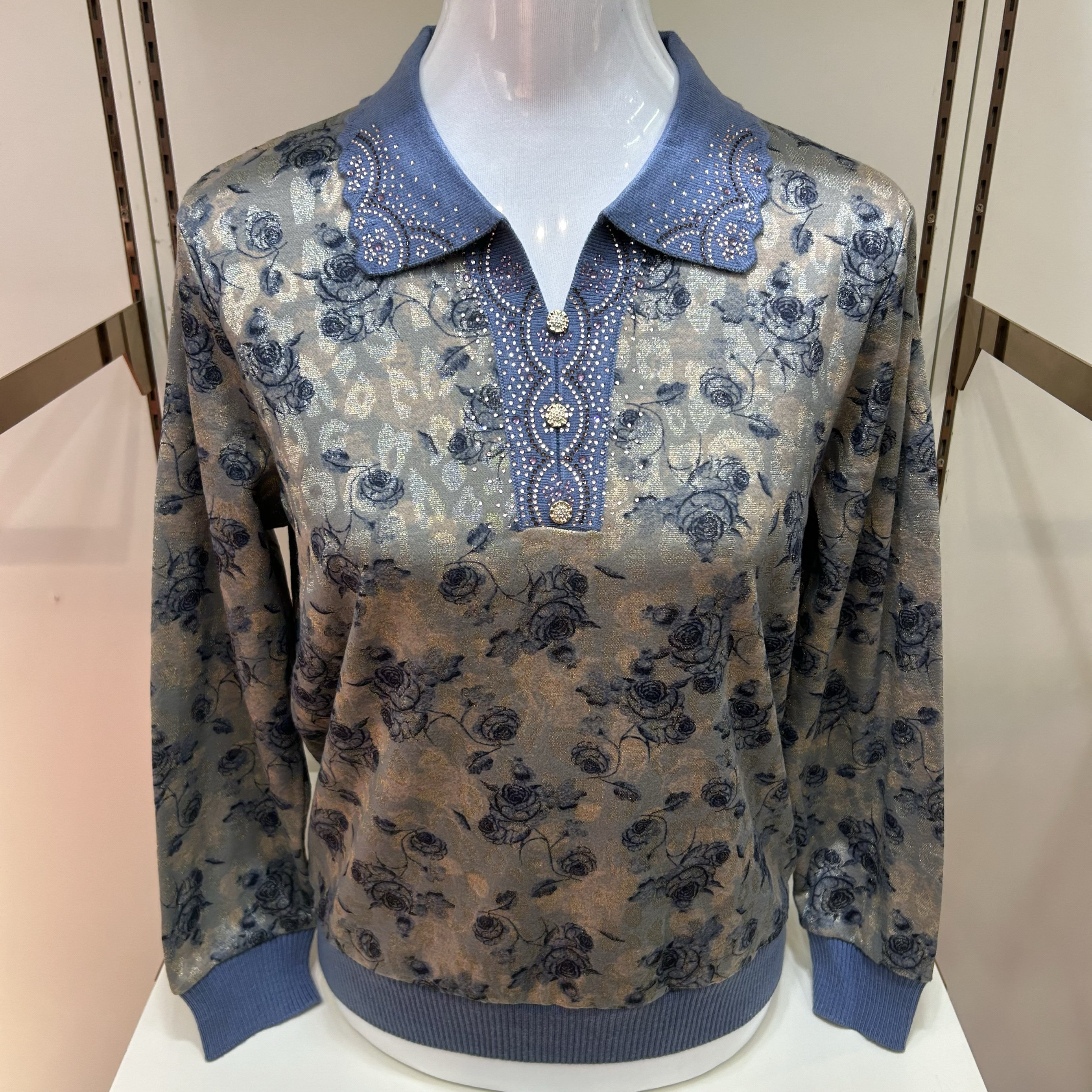 艾靓依带钻翻领T恤衫妈妈装秋衣