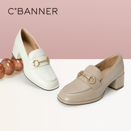 千百度女鞋春秋气质乐福鞋英伦风中跟粗跟通勤真皮单鞋小皮鞋正装
