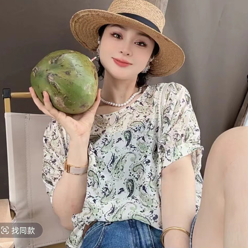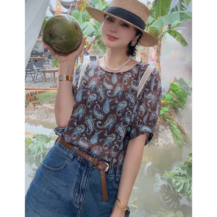 欧洲站2025夏季新款欧货时尚圆领印花短袖衬衫女百搭显瘦上衣潮
