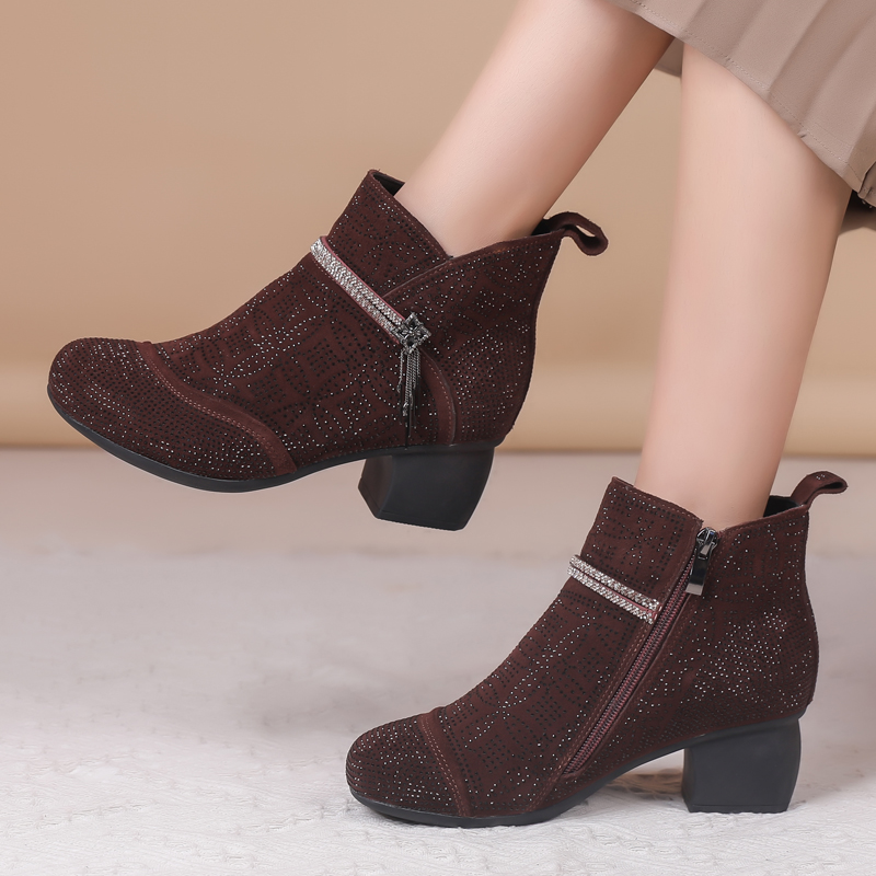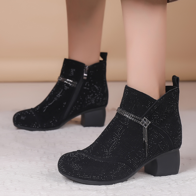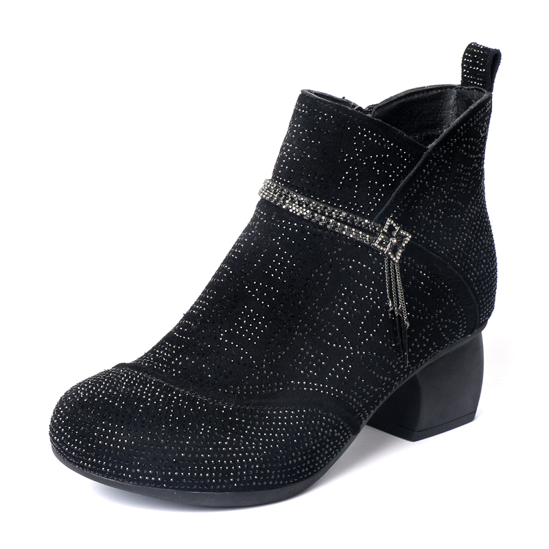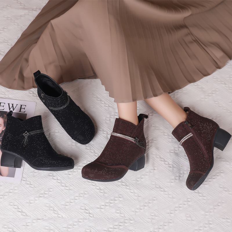 全羊皮粗跟短靴百搭水钻妈妈女鞋