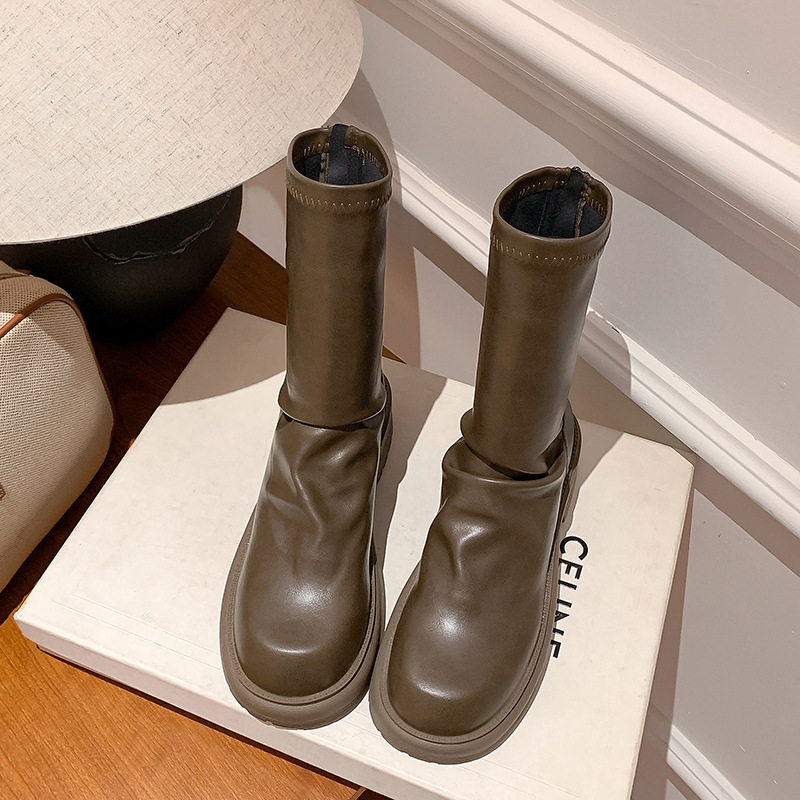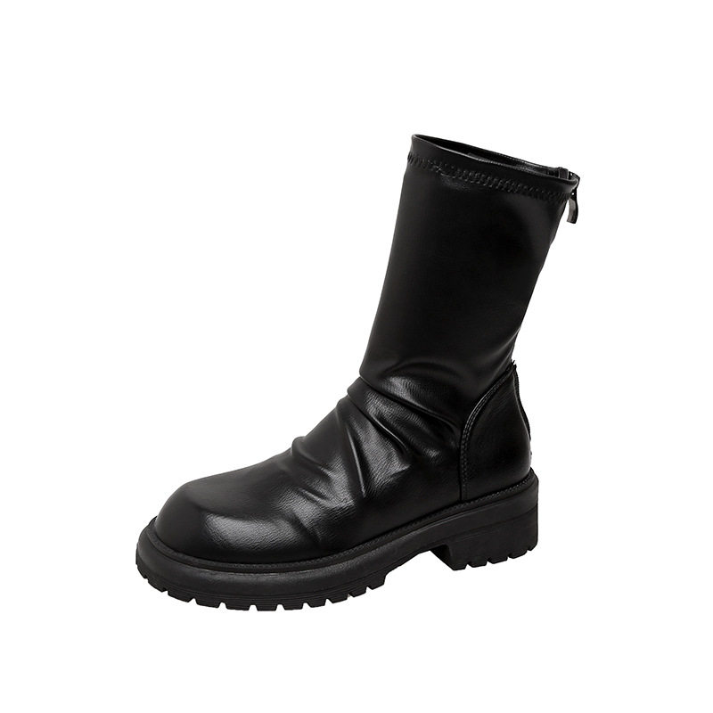 牛皮款苏茵茵同款 粗跟厚底瘦瘦靴圆头褶皱后拉链堆堆短靴女真皮