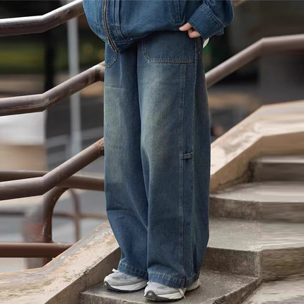 日系复古大码工装牛仔裤男女生oversize水洗复古蓝直筒宽松休闲裤
