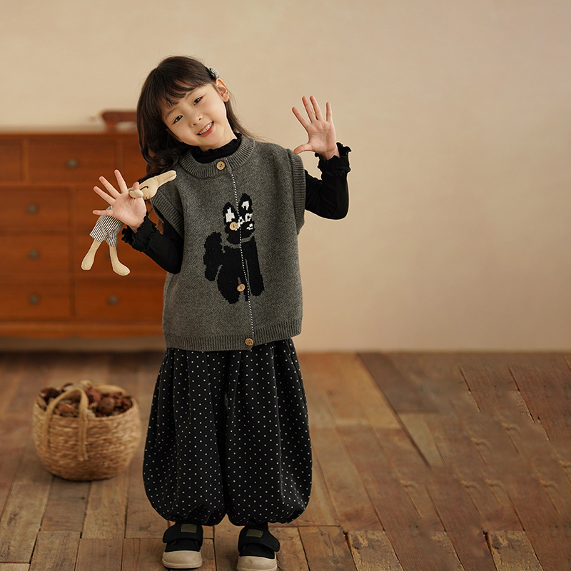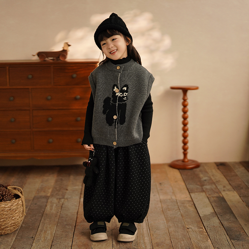 砚台家女童针织开衫背心秋冬季儿童卡通猫咪马甲外穿毛衣宝宝上衣