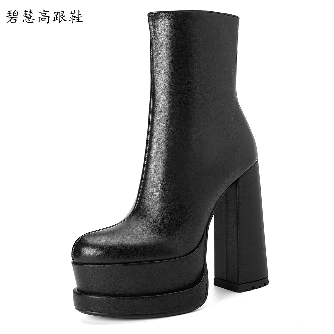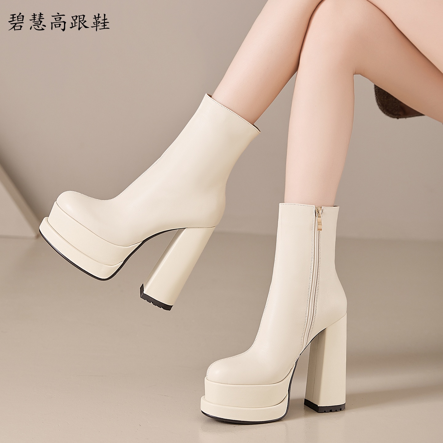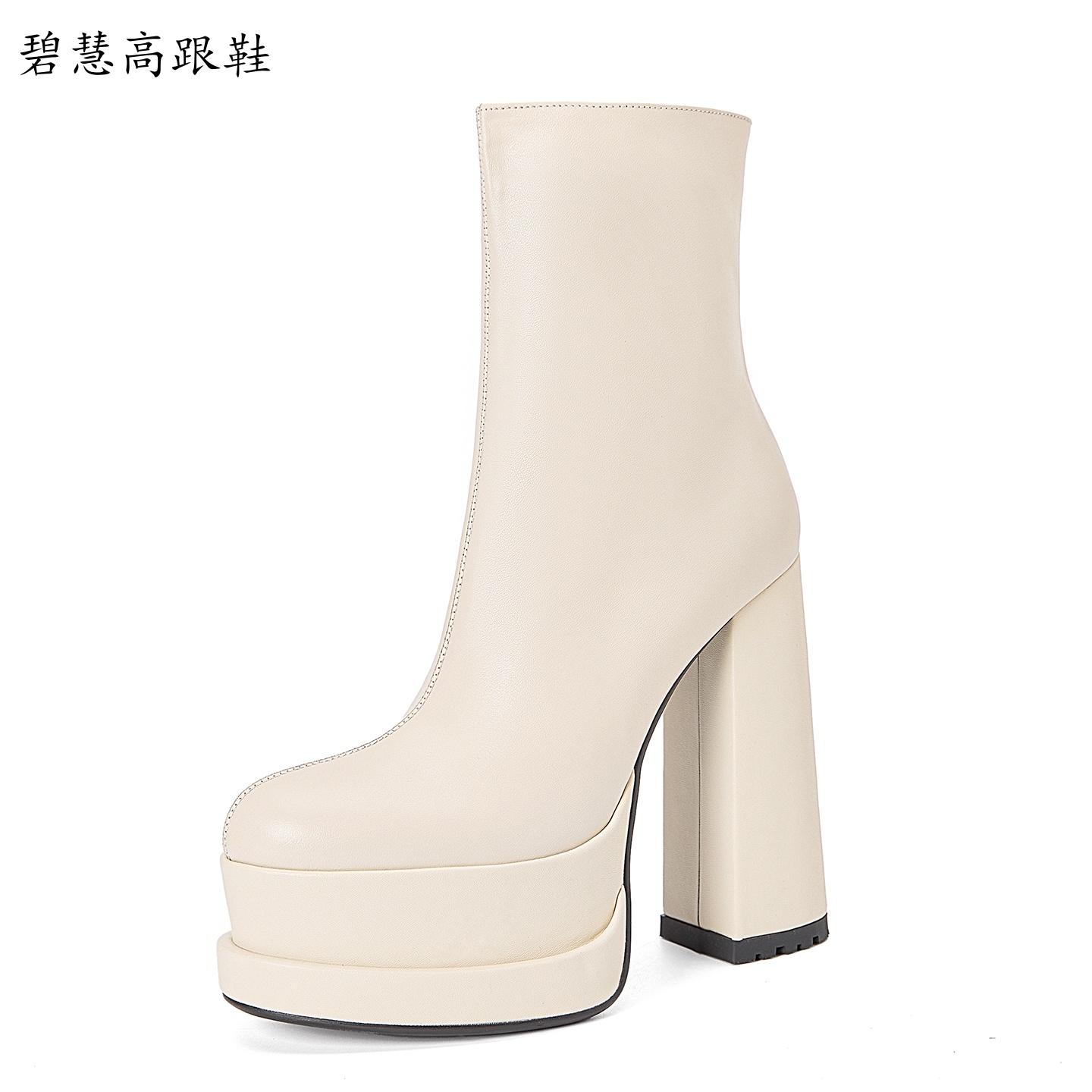 碧慧~米白色牛皮13.8CM粗跟防水台高跟真皮女靴小个子不累脚短靴
