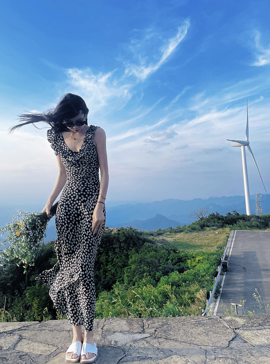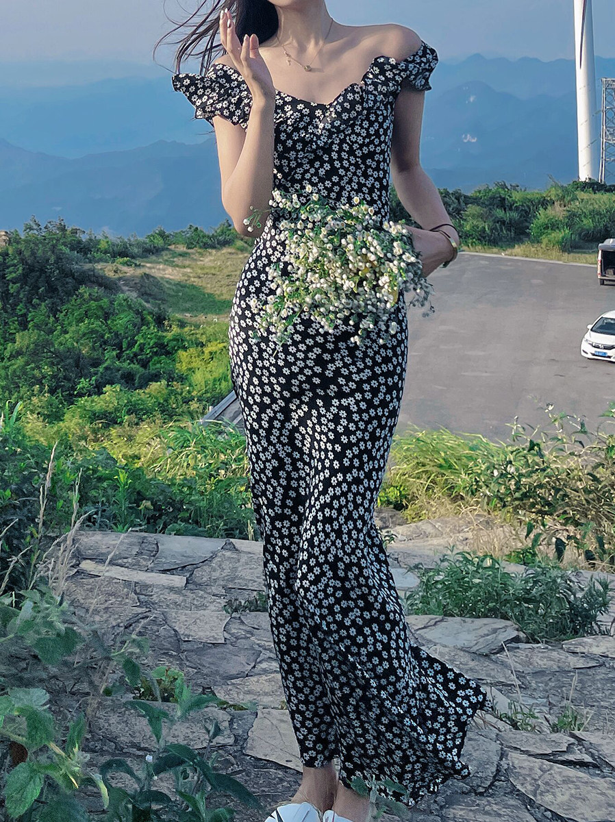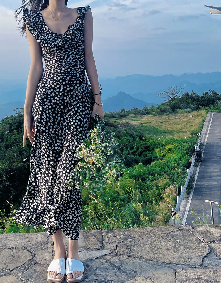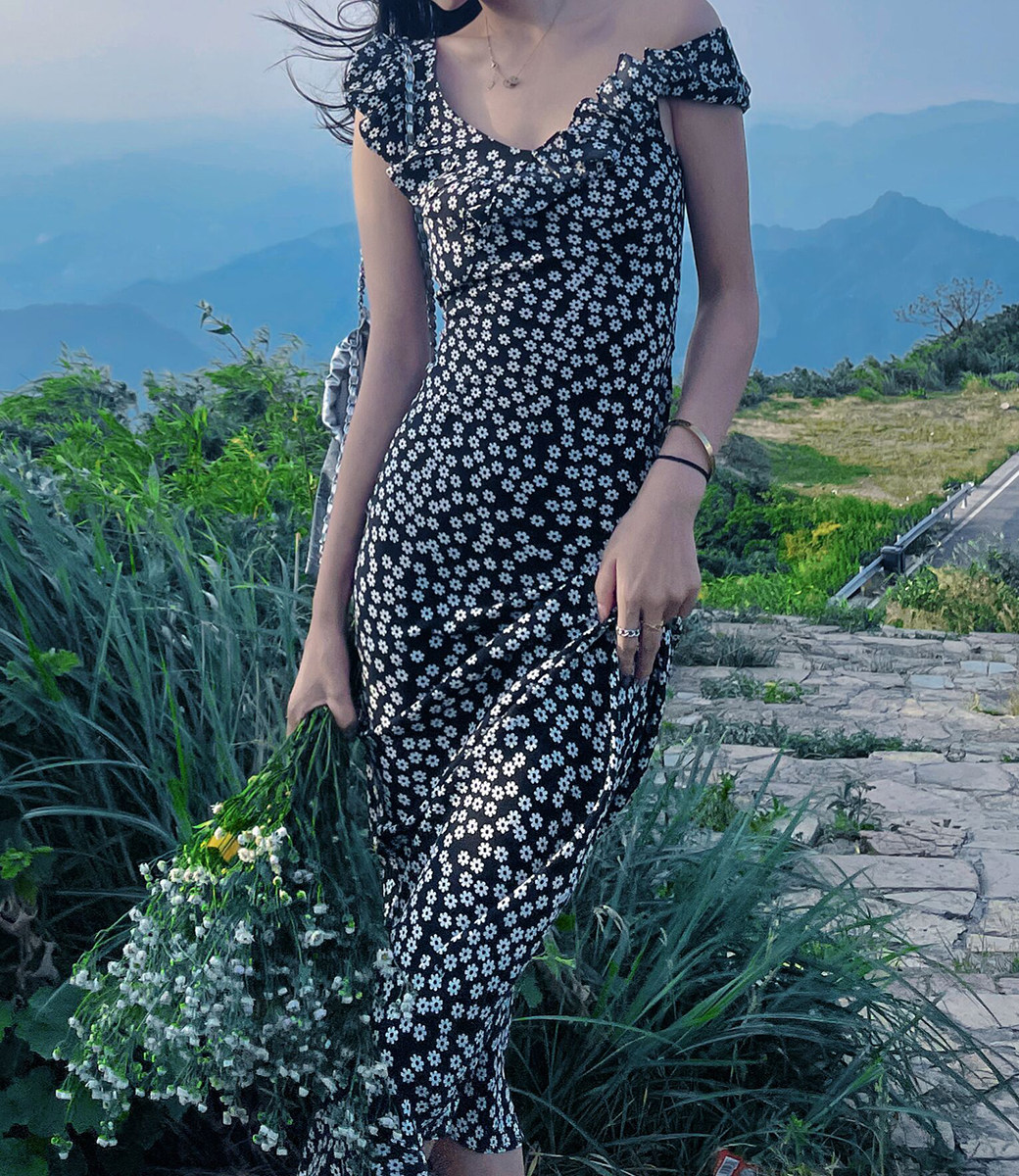 小鱼自制法式复古荷叶花边真丝连衣裙 雏菊印花显瘦纸片人长款裙