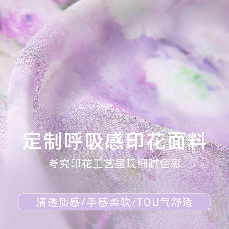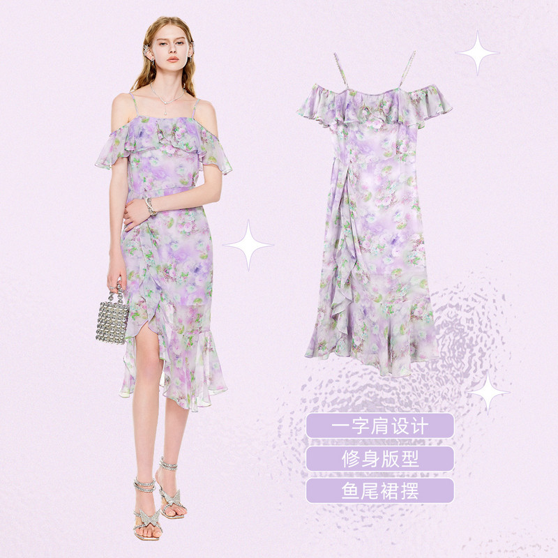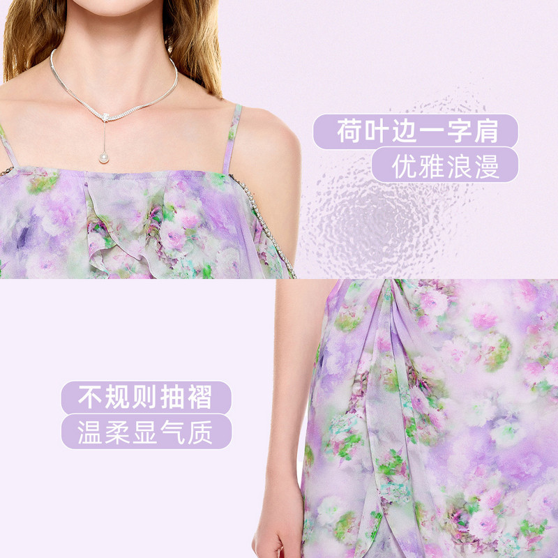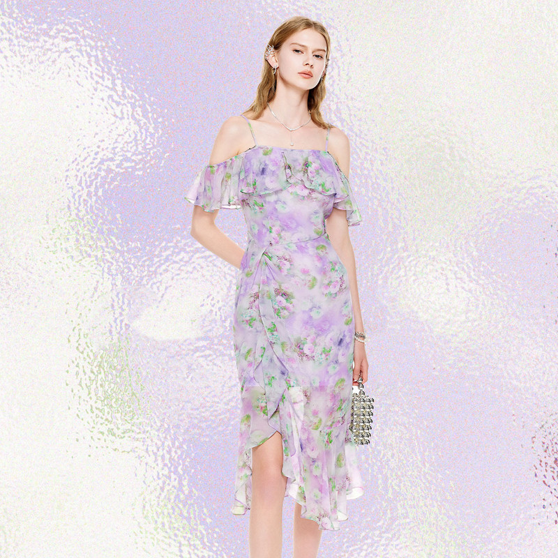 MISSCOCOON【莫奈花园】24夏新款印花荷叶边一字肩开叉吊带连衣裙