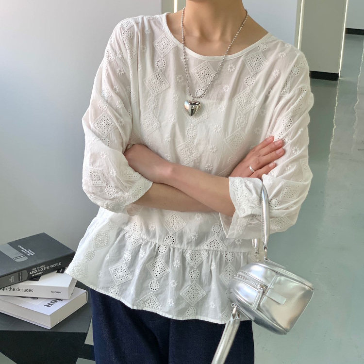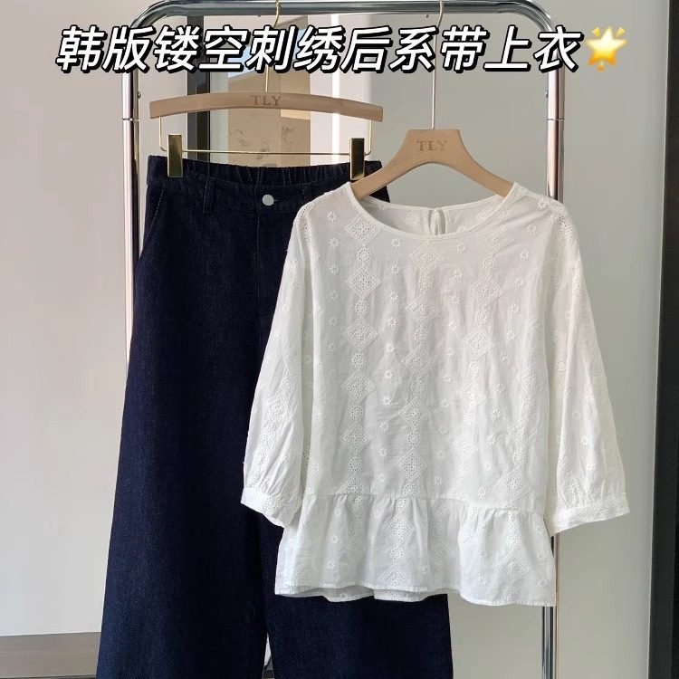 韩版圆领刺绣镂空泡泡袖t恤2025新款出面七分袖短袖宽松显瘦上衣