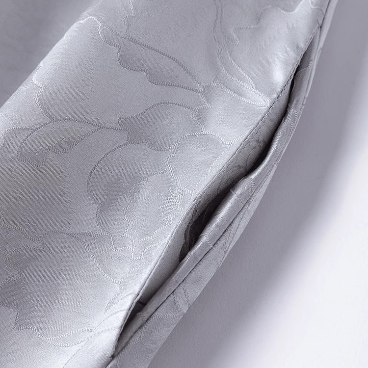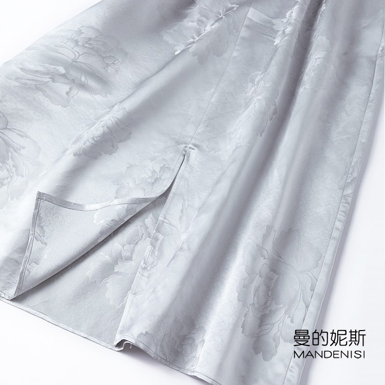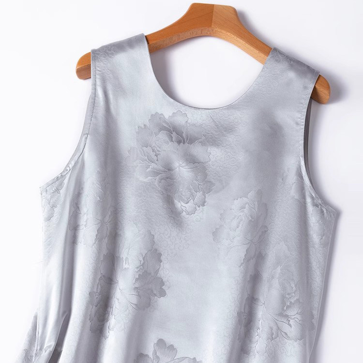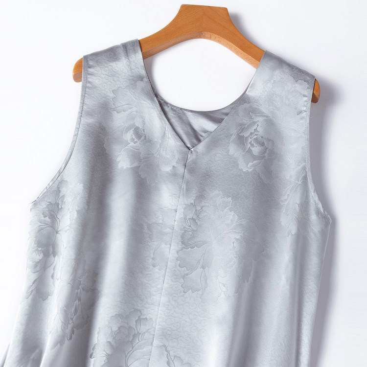 前后两穿!银灰色35姆米重磅真丝提花缎圆领V领开叉背心连衣长裙