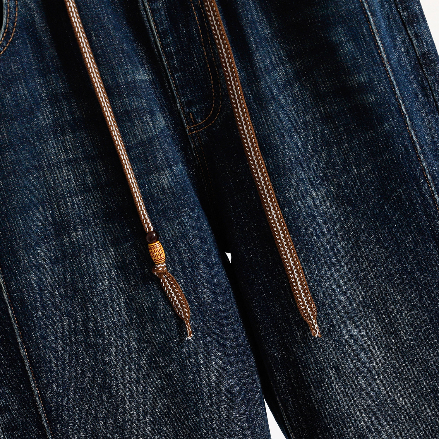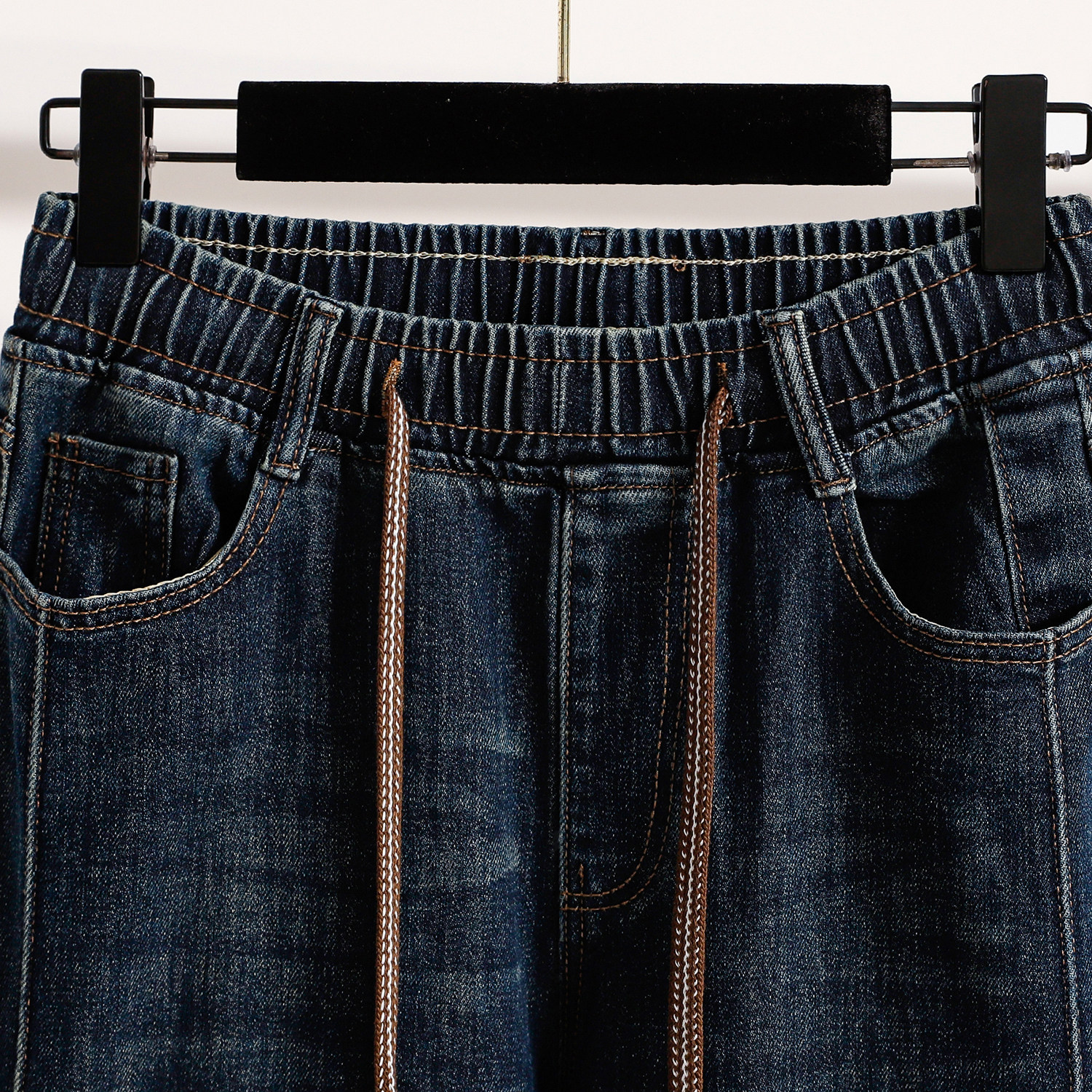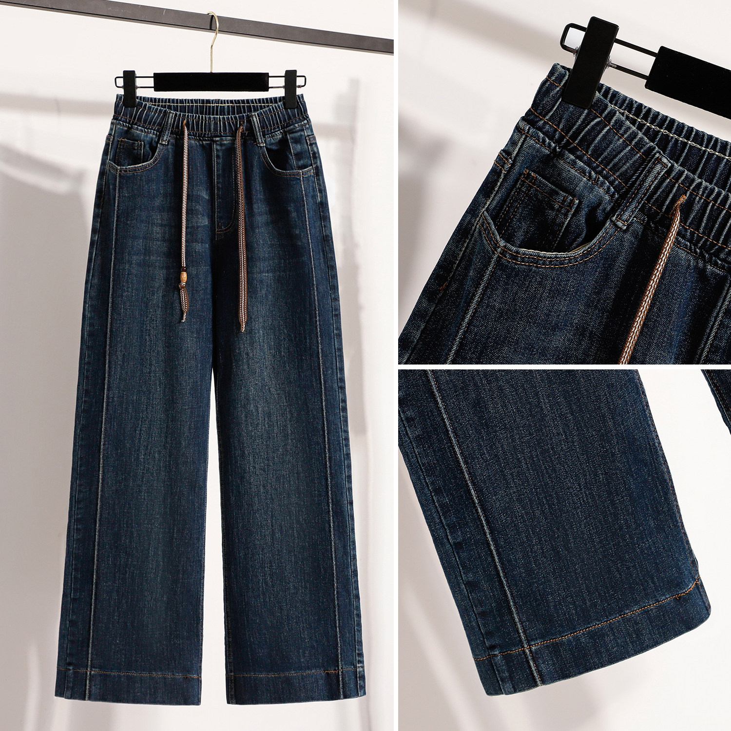 大码女装秋季百搭显瘦窄版微弹牛仔直筒长裤子抽绳腰带篮色薄款