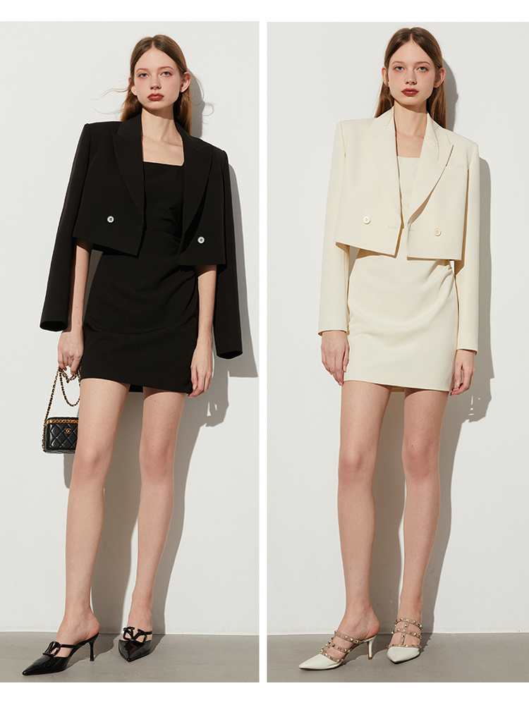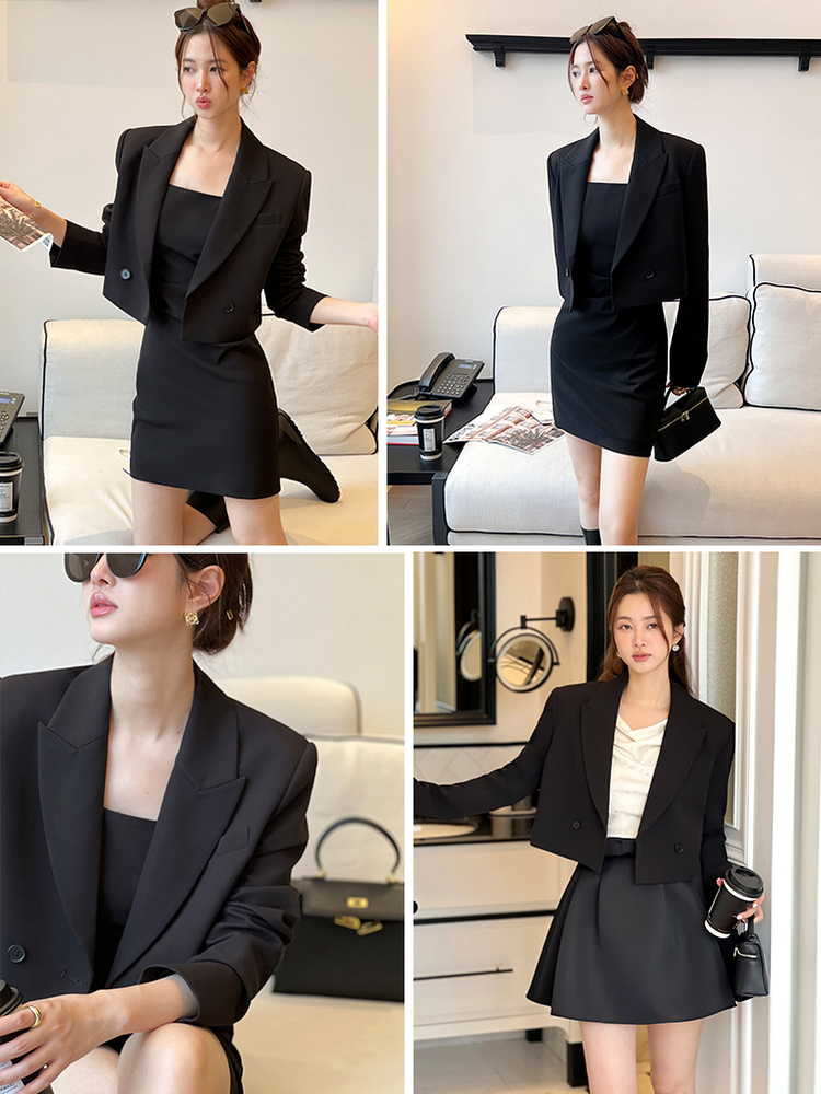 DPLAY2025春季气质简约黑色套装女休闲短款西装外套流行正肩长袖