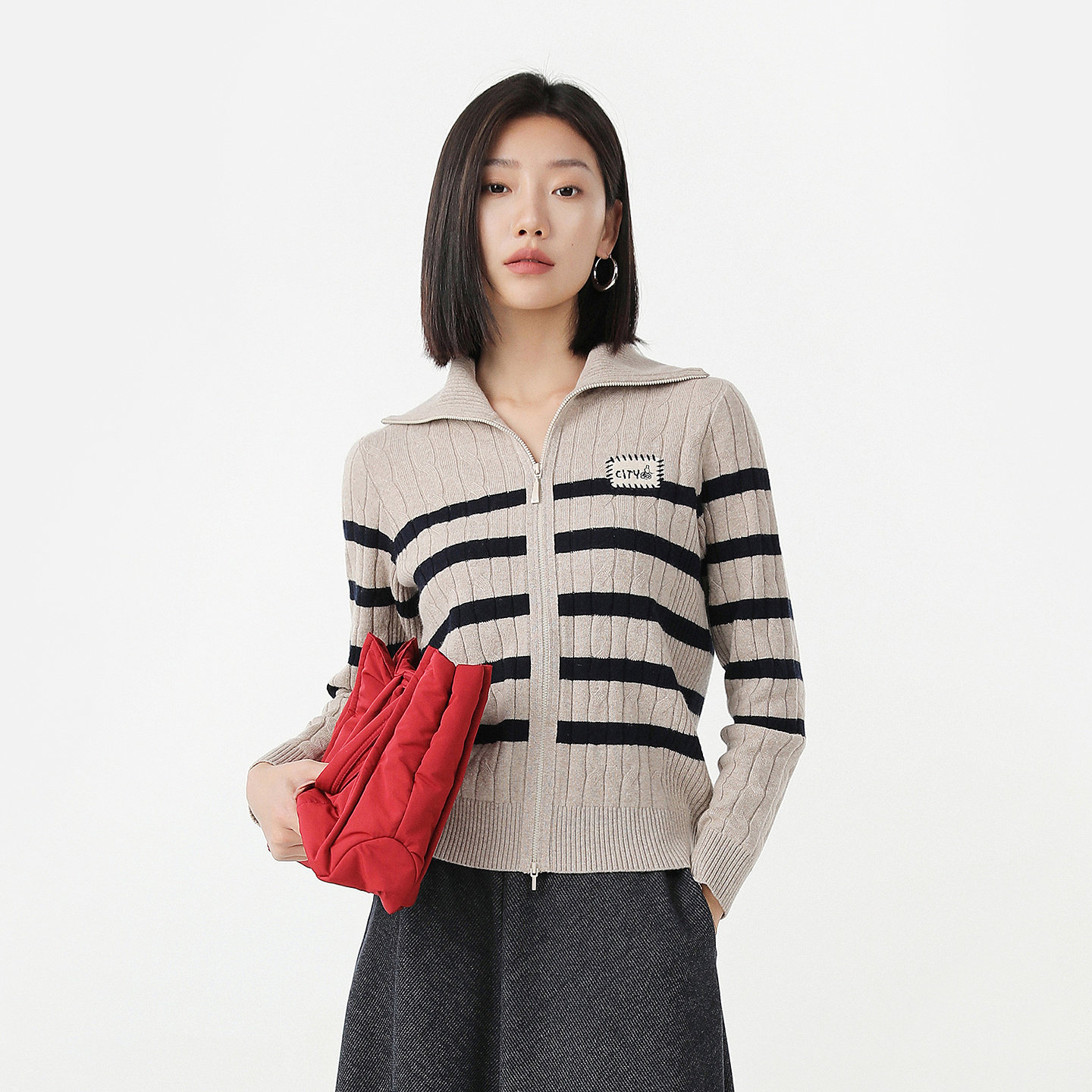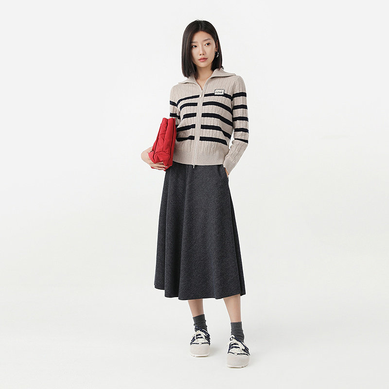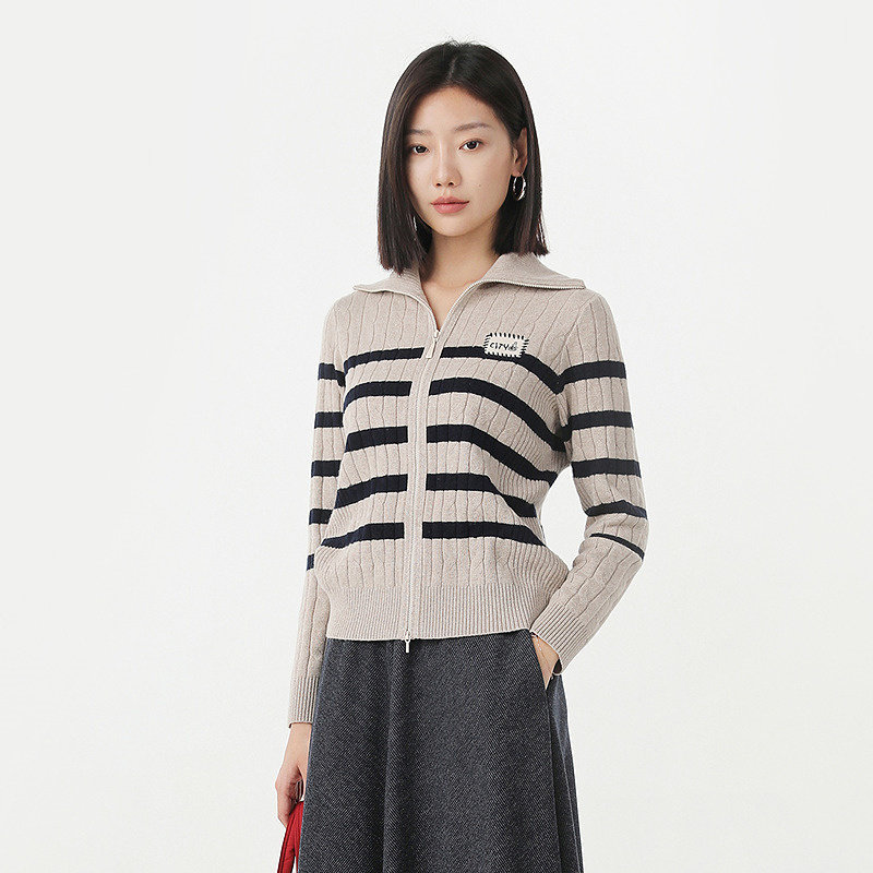 [专柜同款]Yifini/易菲2025冬季新款条纹翻领时尚通勤针织开衫女