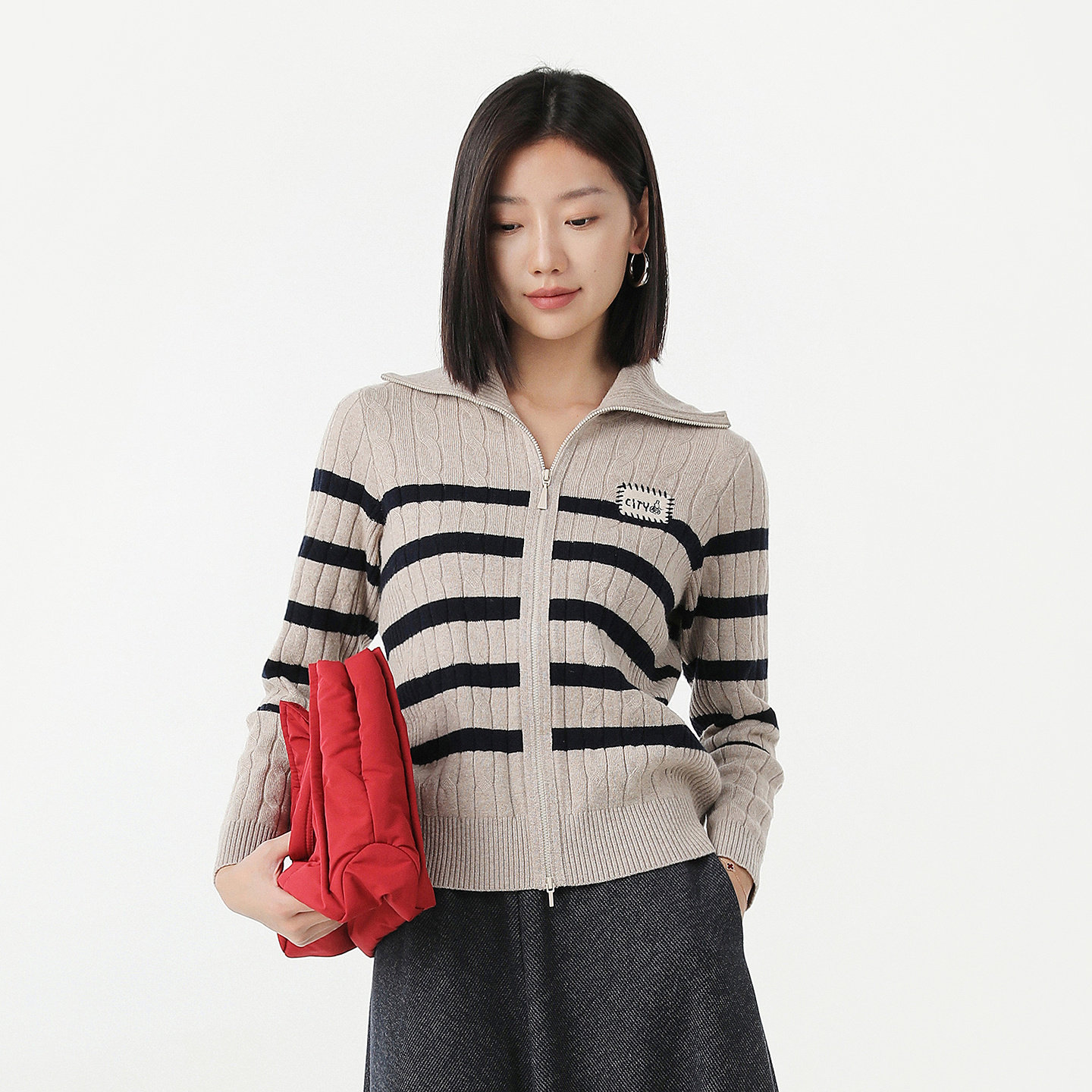 条纹翻领时尚通勤针织开衫女