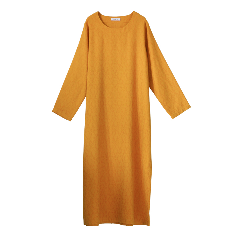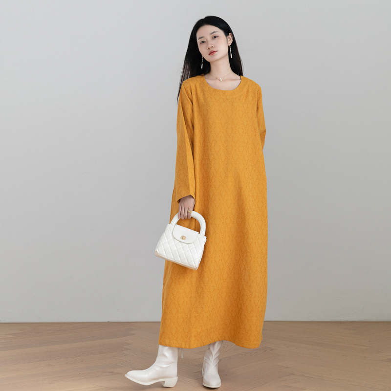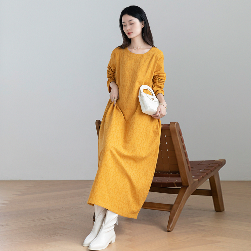 显肤白高级气质黄棉麻袍子连衣裙女秋款原创设计文艺简约宽松长裙
