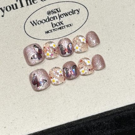 爆闪蝴蝶花朵儿童穿戴甲手工美甲