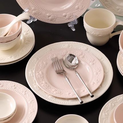 浮雕奶油风碗碟套装家用盘子