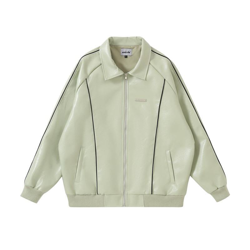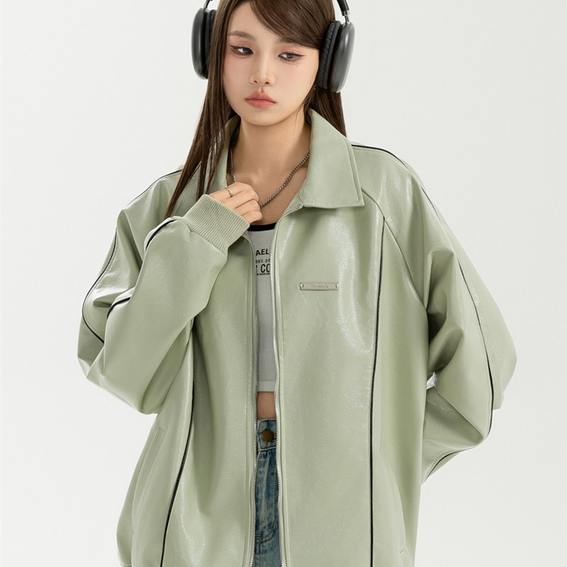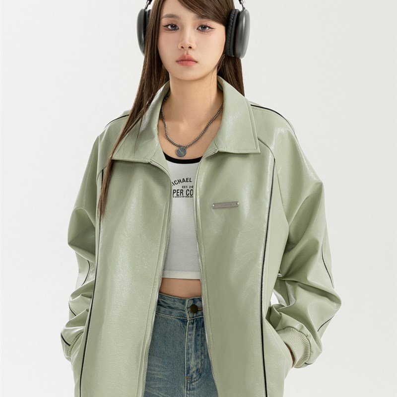 Unizzle丨银标翻领皮衣外套PU皮质休闲宽松夹克外套国潮男女情侣