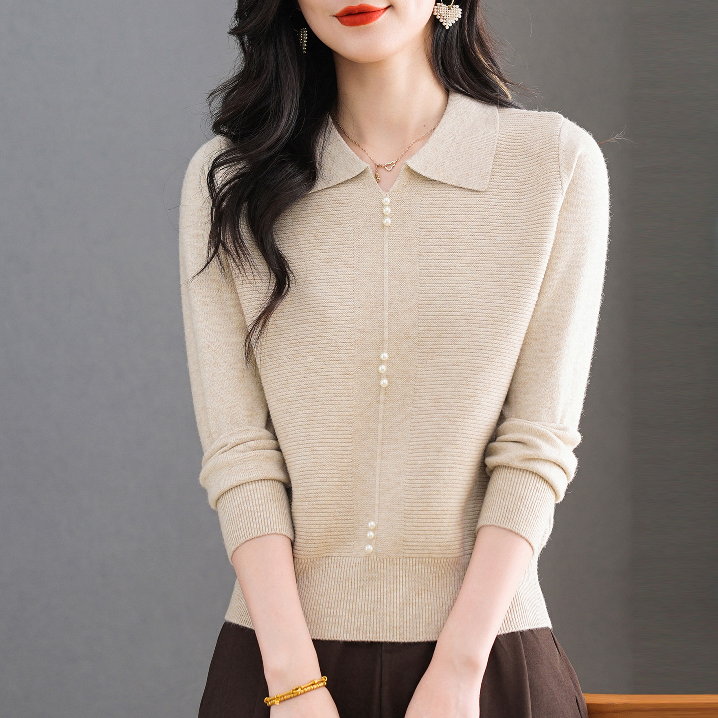 鄂尔多斯市翻领羊毛衫女2025秋冬新款针织打底衫短款宽松钉珠毛衣