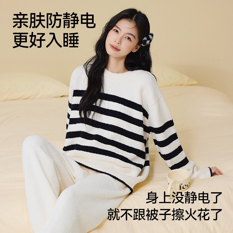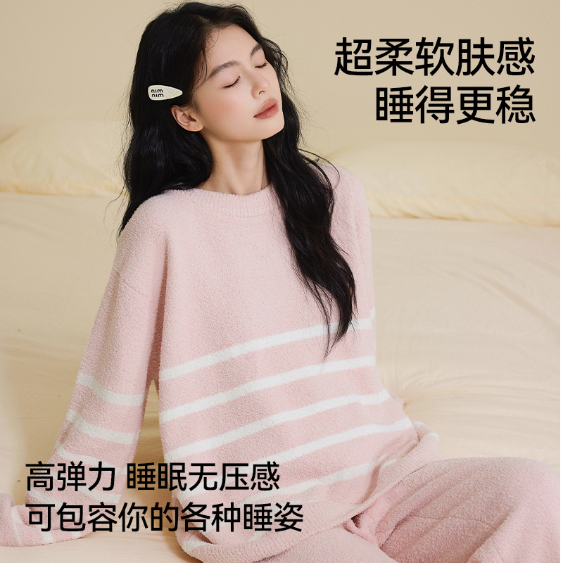 MIIOW/猫人睡裙女秋冬宽松半边绒加绒加厚款睡衣套装保暖家居服D