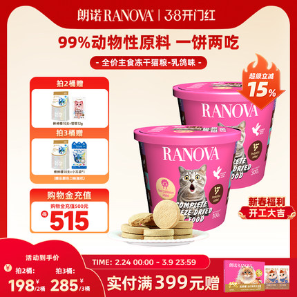 朗诺主食冻干猫粮鸡肉乳鸽味300g肉饼冻干桶生骨肉猫粮