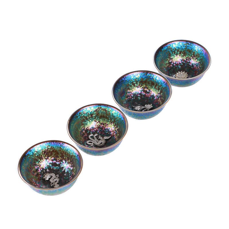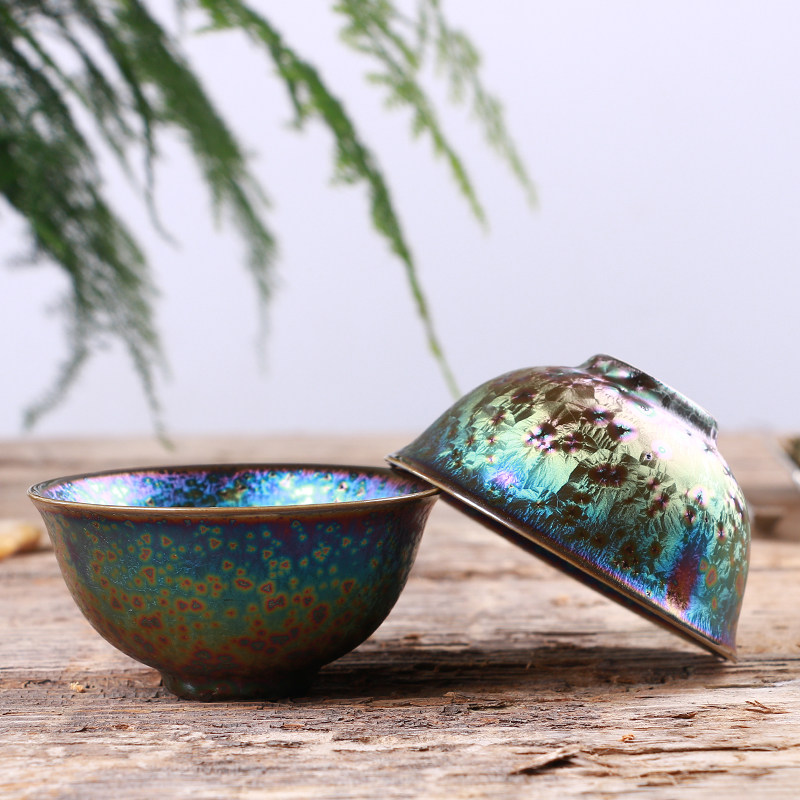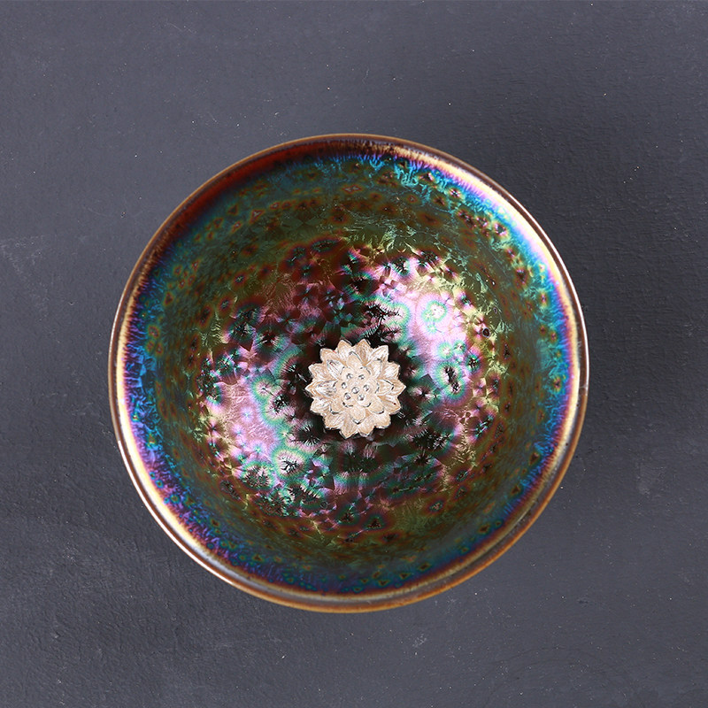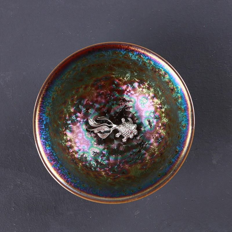 七彩孔雀建盏银鱼杯窑变天目建盏品茗茶杯陶瓷大号镶银饰主人杯子