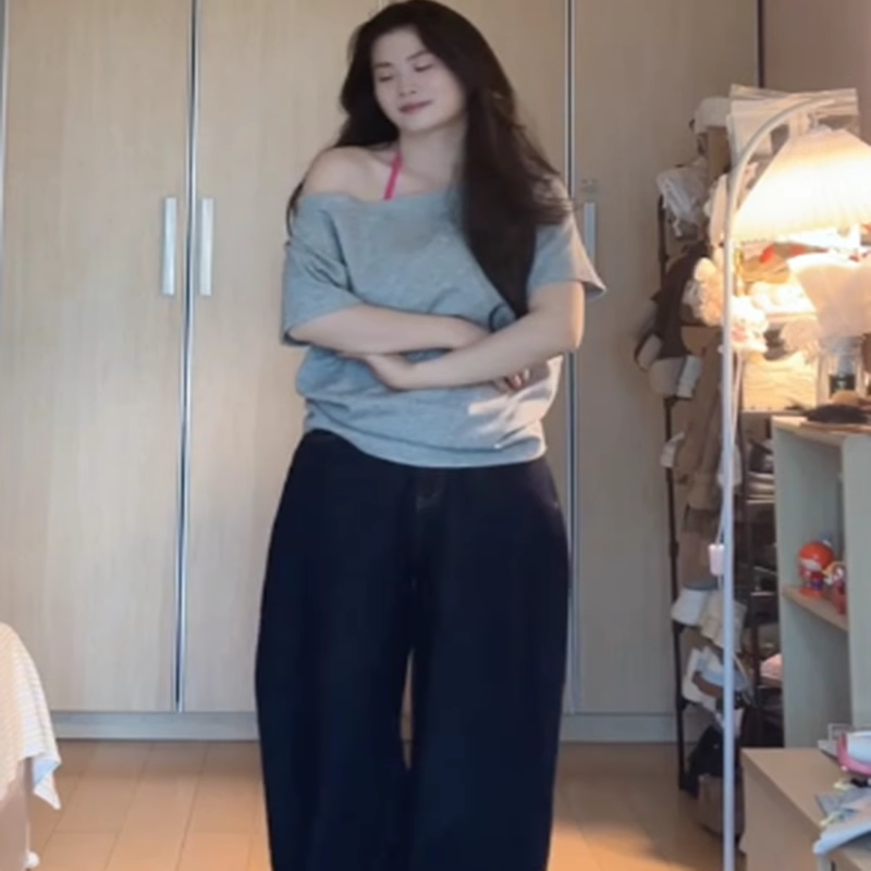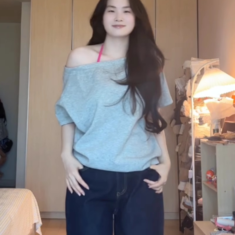 大码设计一字领露肩短袖T恤女