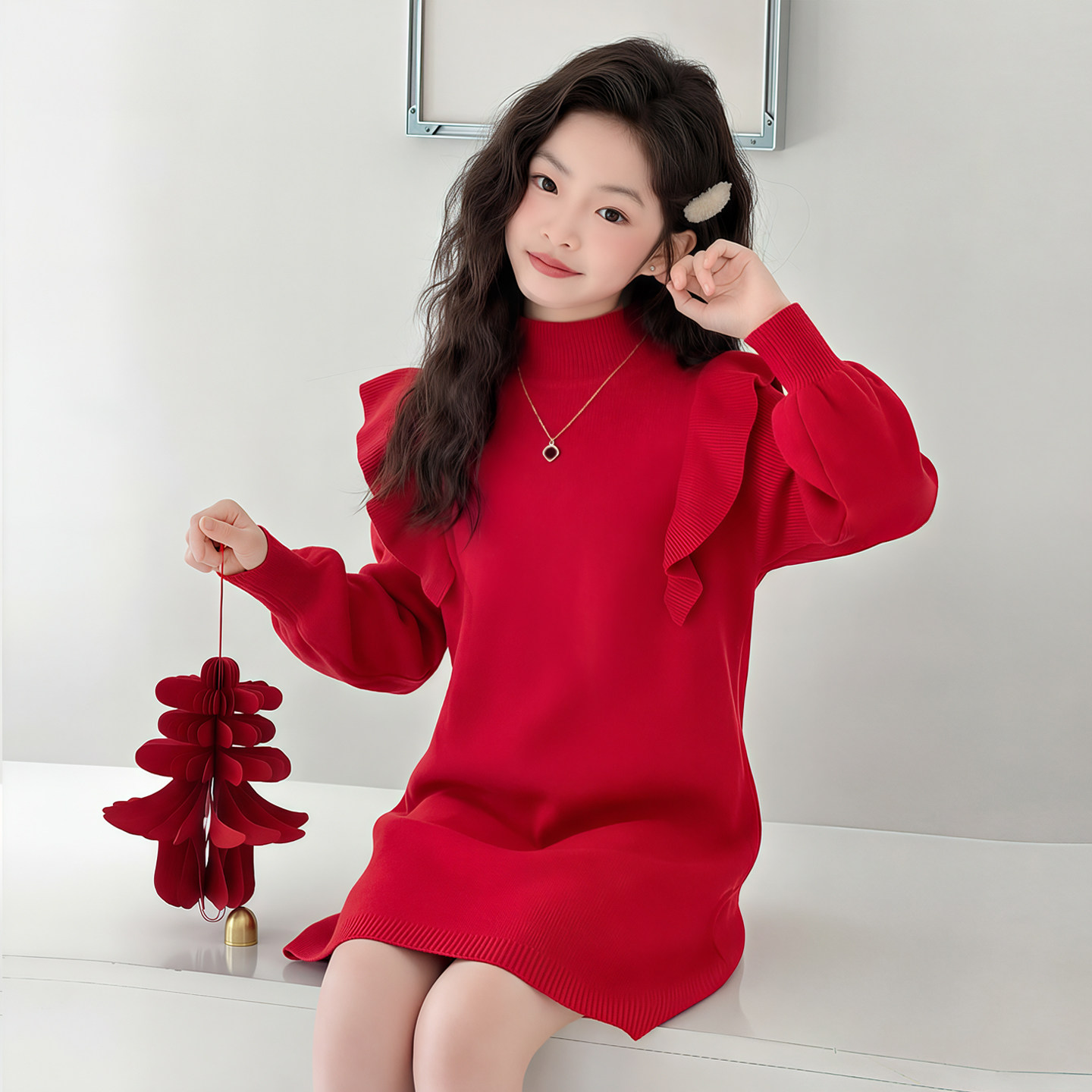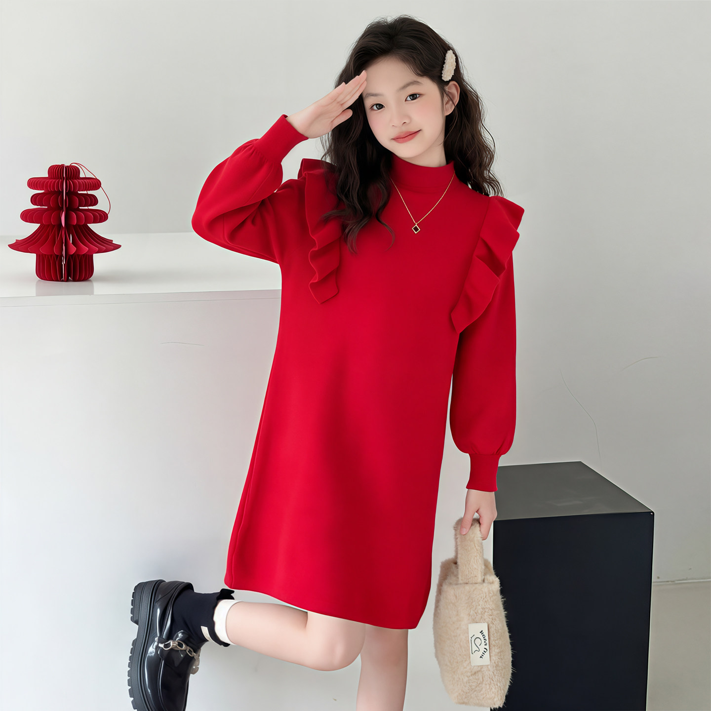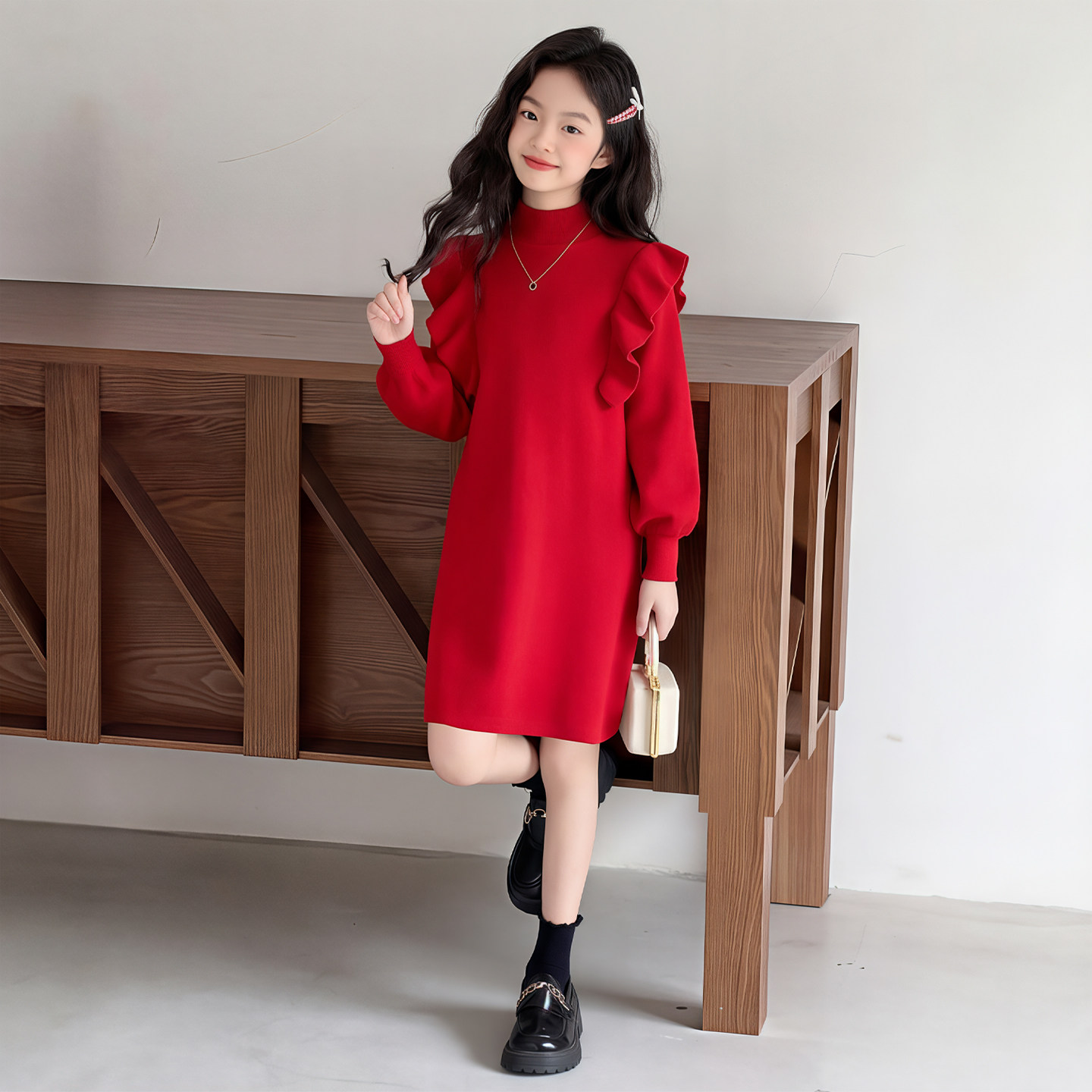 女中大童公主裙花边袖加绒拜年服