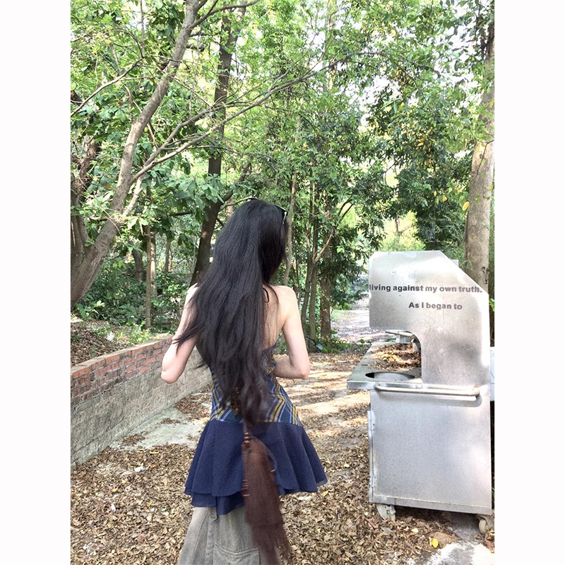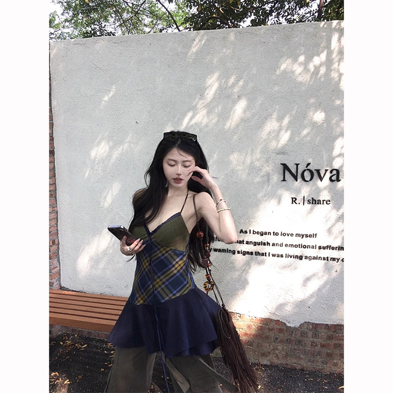 复古辣妹小众设计感V领吊带背心女春夏拼接蕾丝格纹上衣式连衣裙