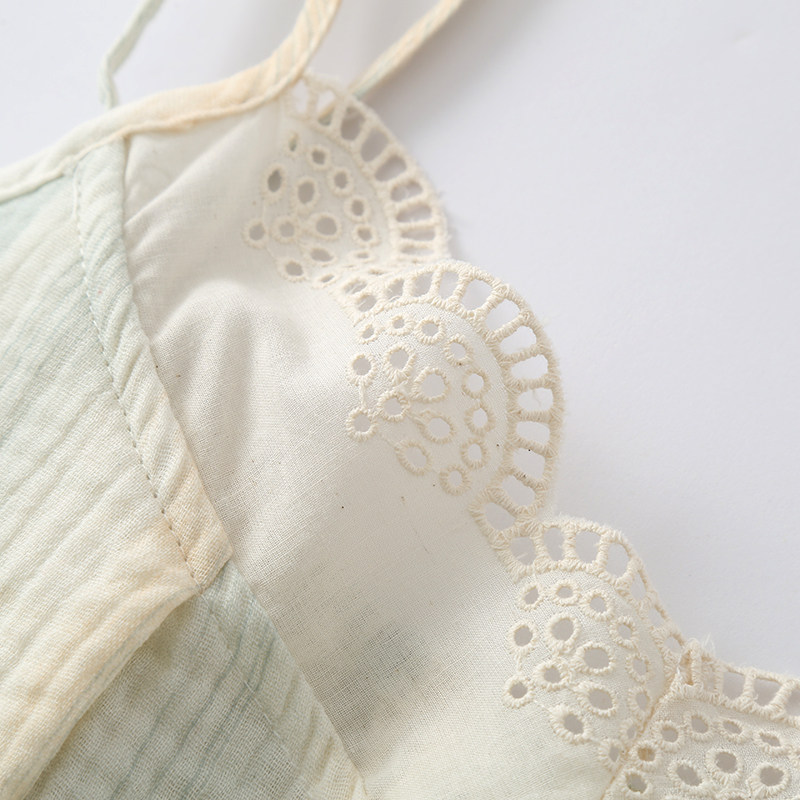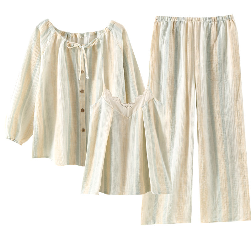 花边三件套睡衣女春秋夏季纯棉纱布薄款长袖吊带长裤家居服套装