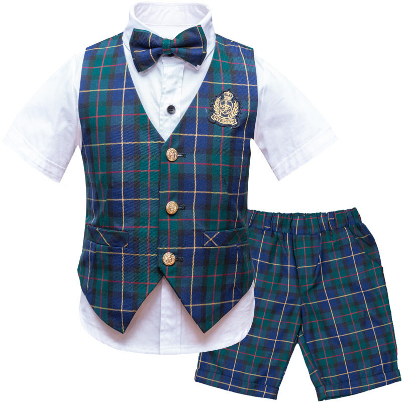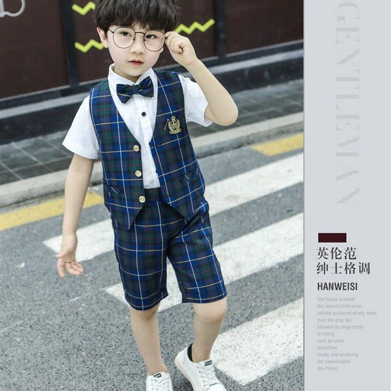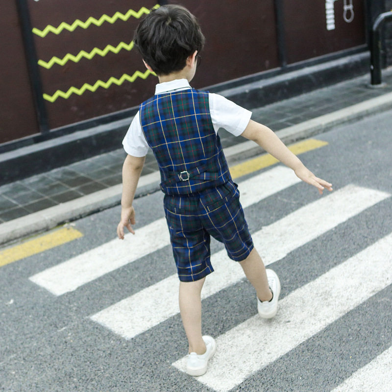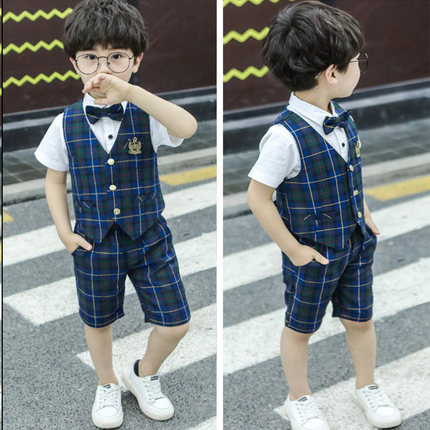 男童2020新款夏季短袖花童礼服中小童英伦风格子马甲西装三件套装