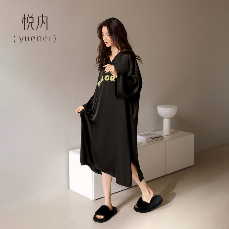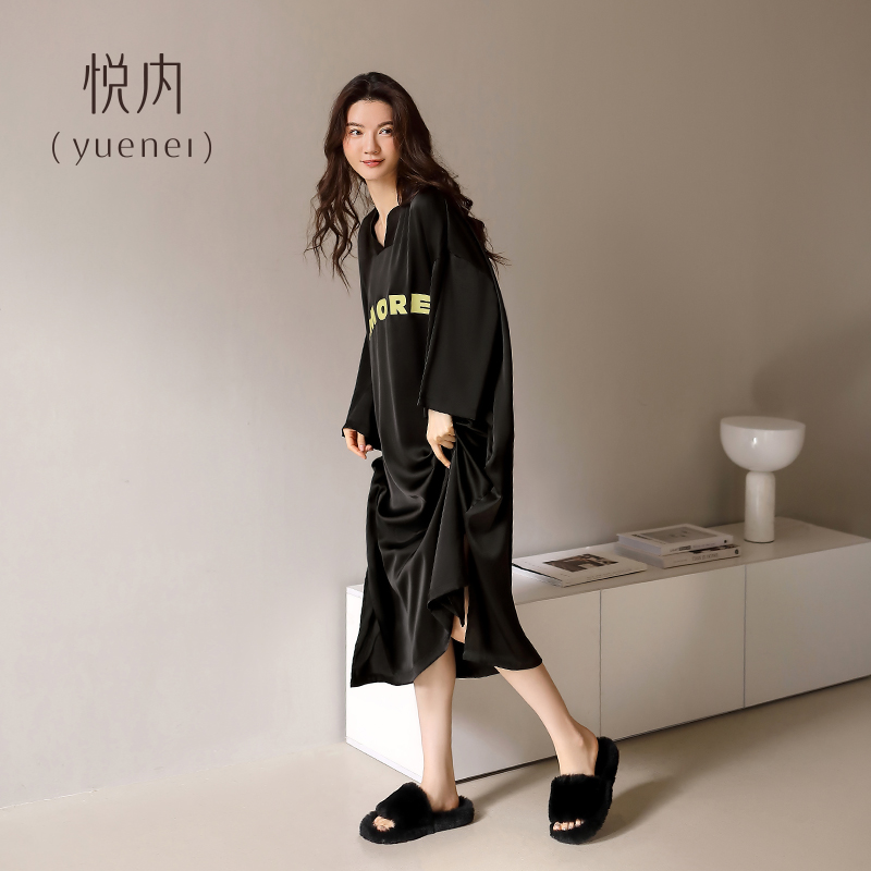 悦内睡裙女士睡衣夏季夏天冰丝绸长袖大码长款春秋款高级感可外穿