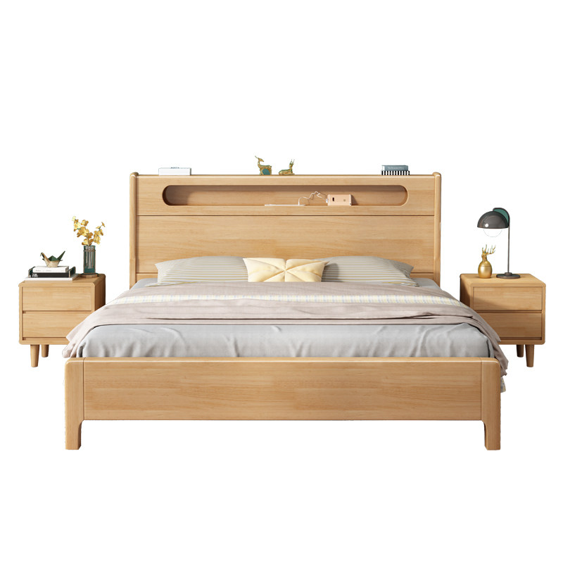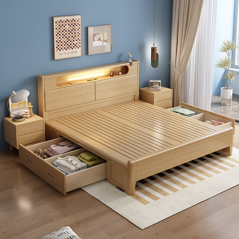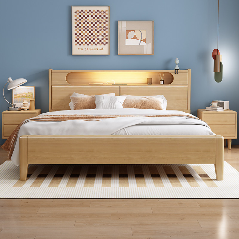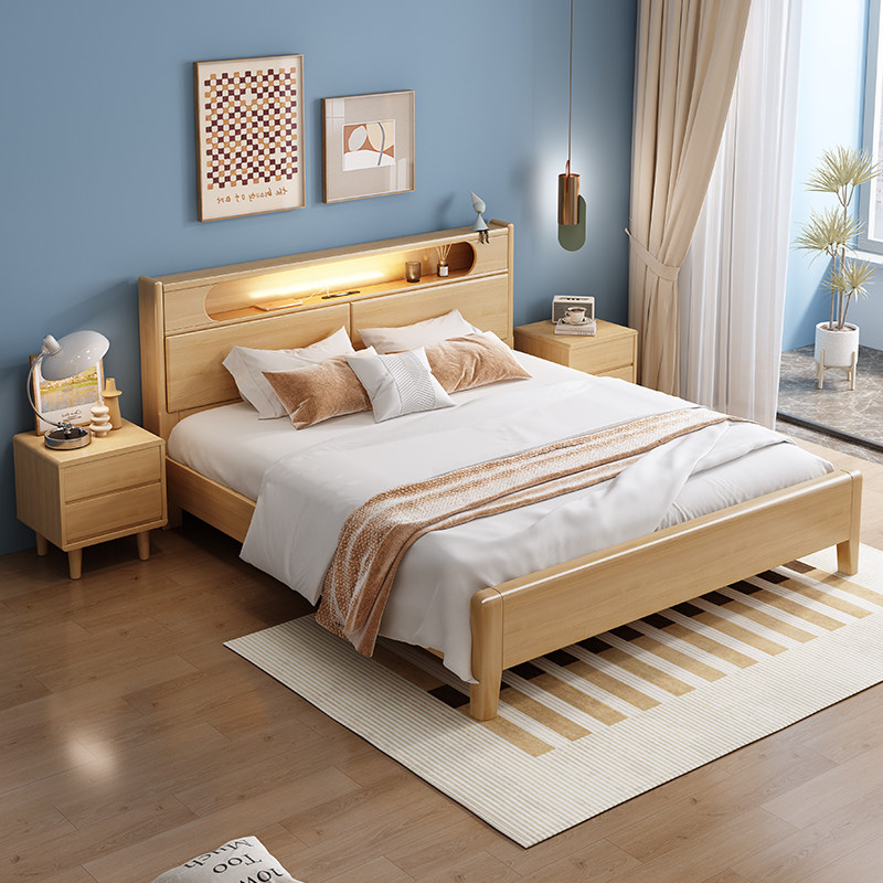 北欧全实木床卧室1.8m床现代简约1.5m主卧双人床带夜灯收纳储物床
