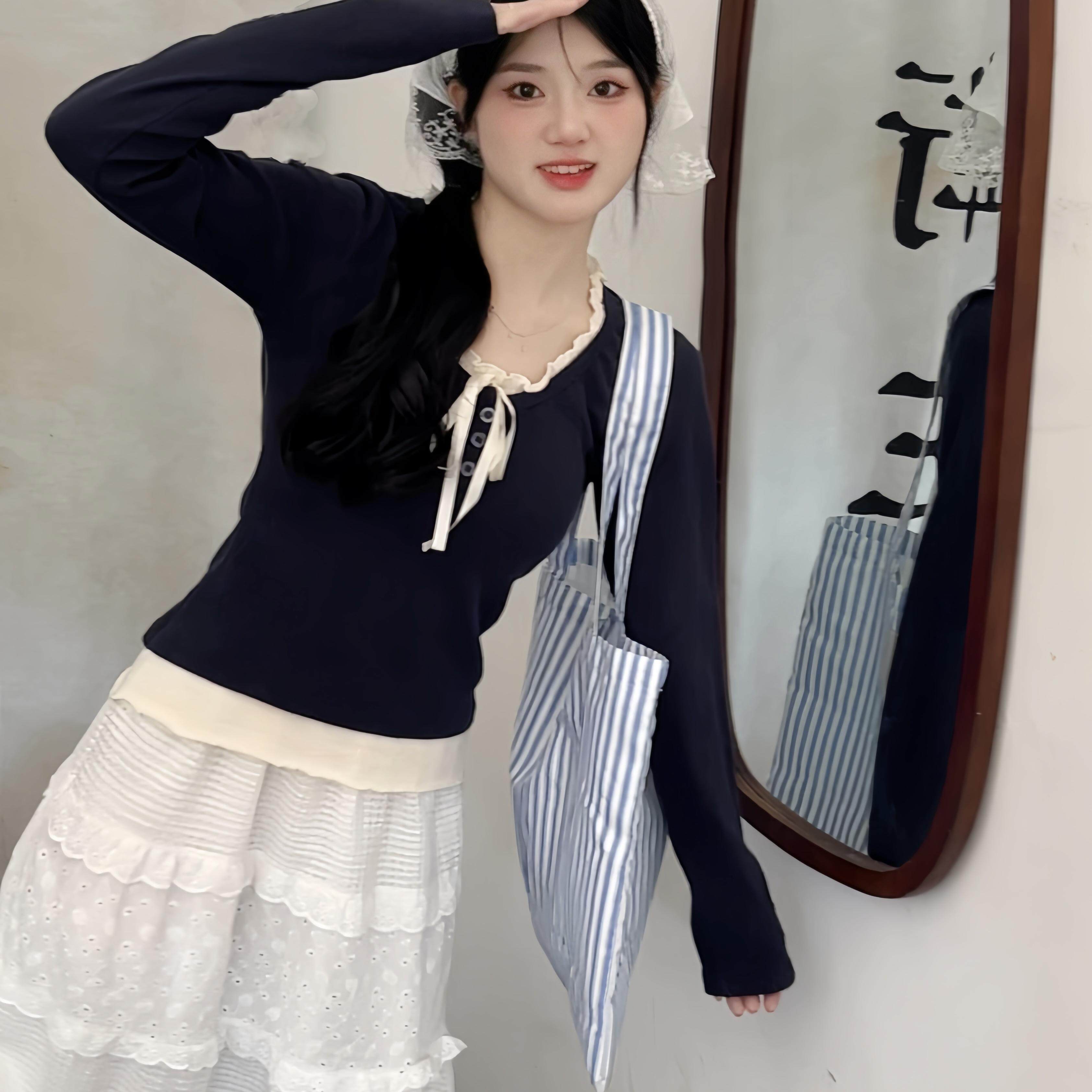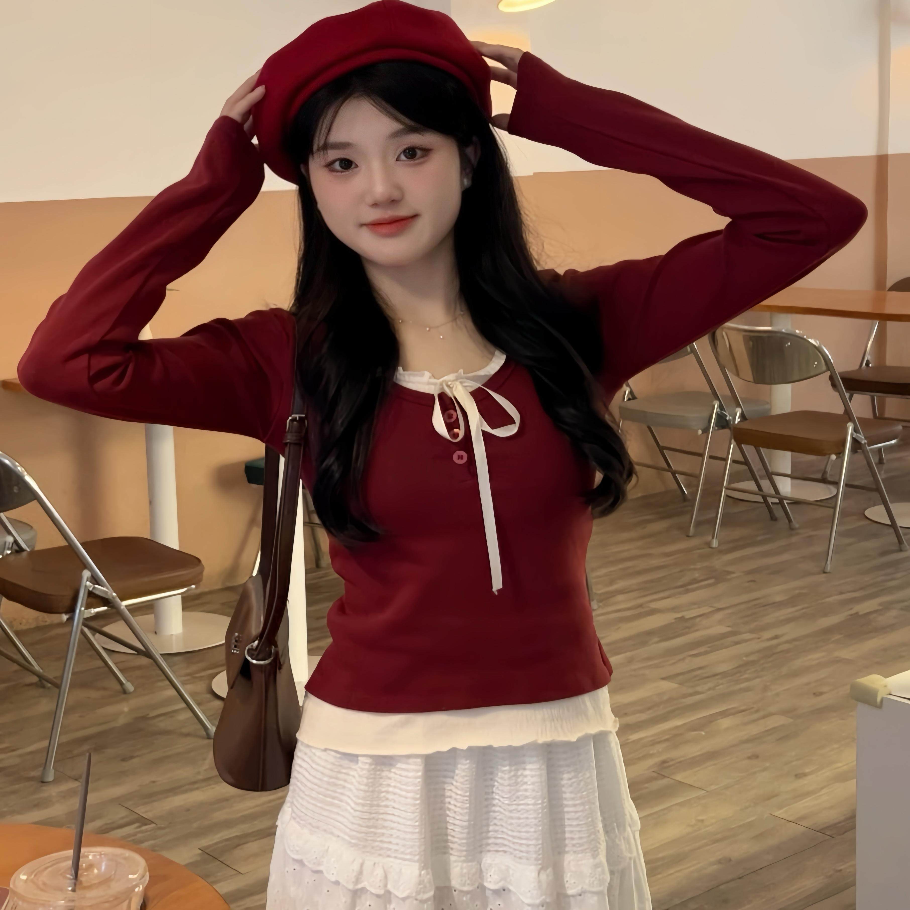 圣诞穿搭红色假两件针织打底衫女蝴蝶结系带修身内搭短款上衣新款