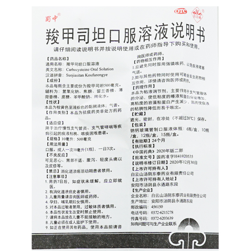 羧甲司坦口服溶液10支口服液慢性支气管炎哮喘白云山汤阴东泰