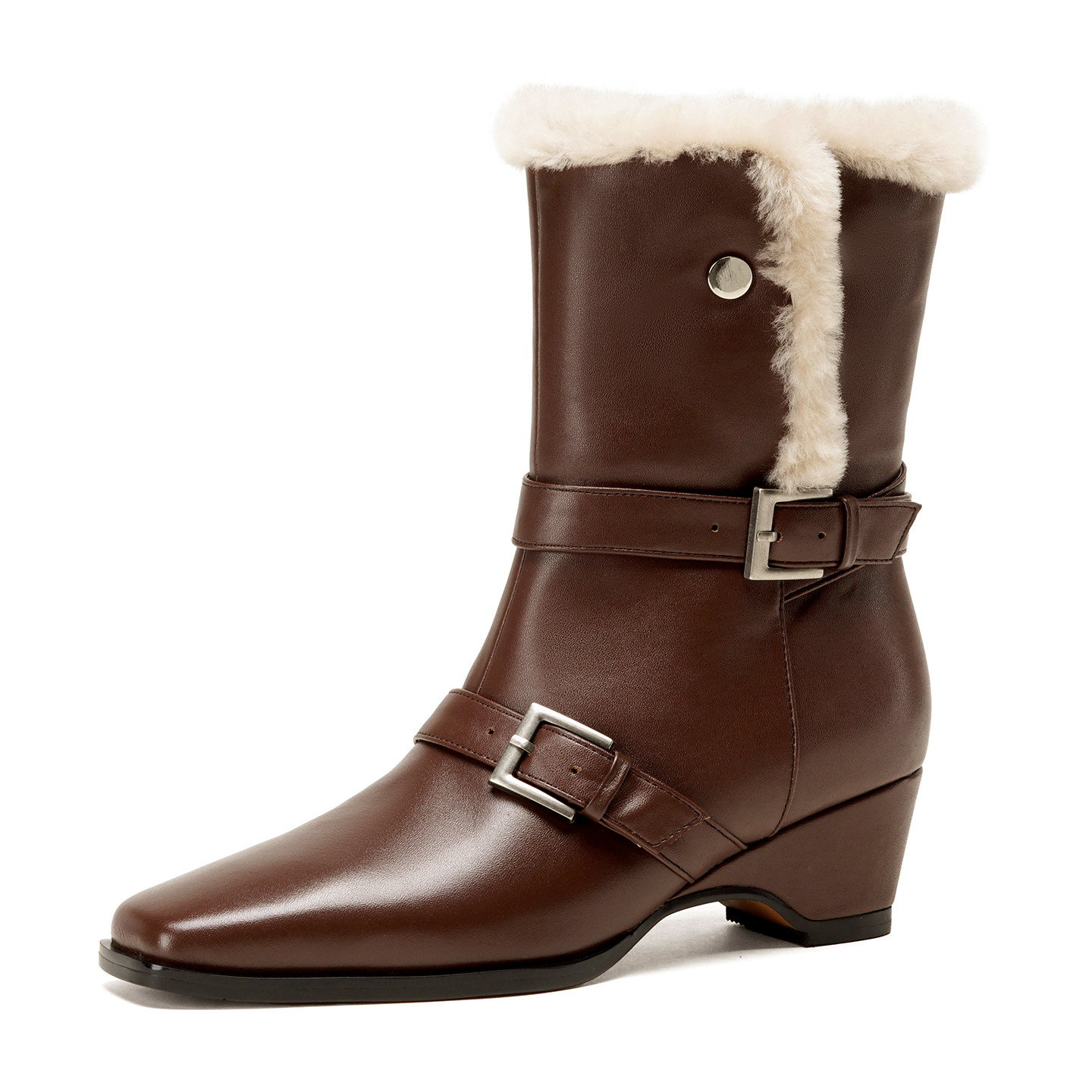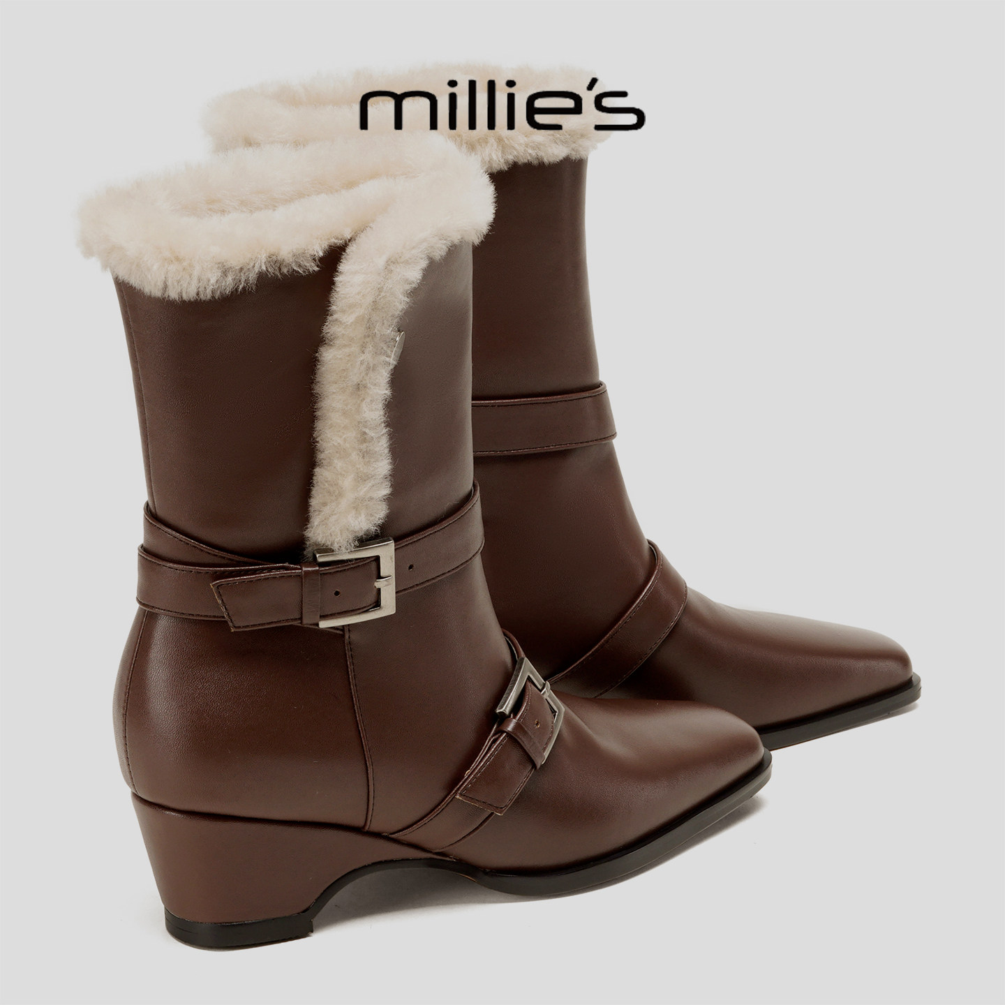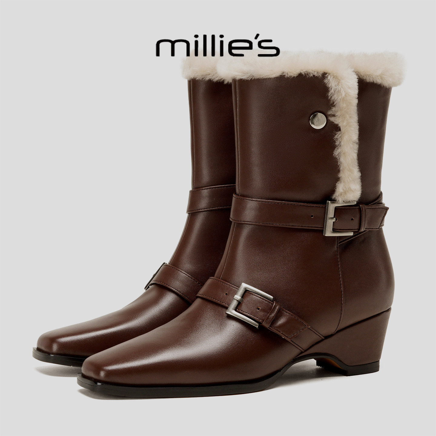MILLIE'S/妙丽英伦风加绒保暖短靴中筒骑士靴皮带扣设计时装靴女