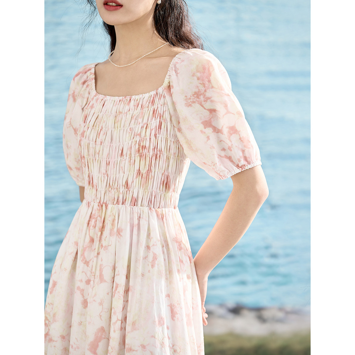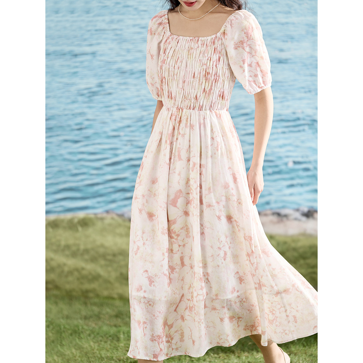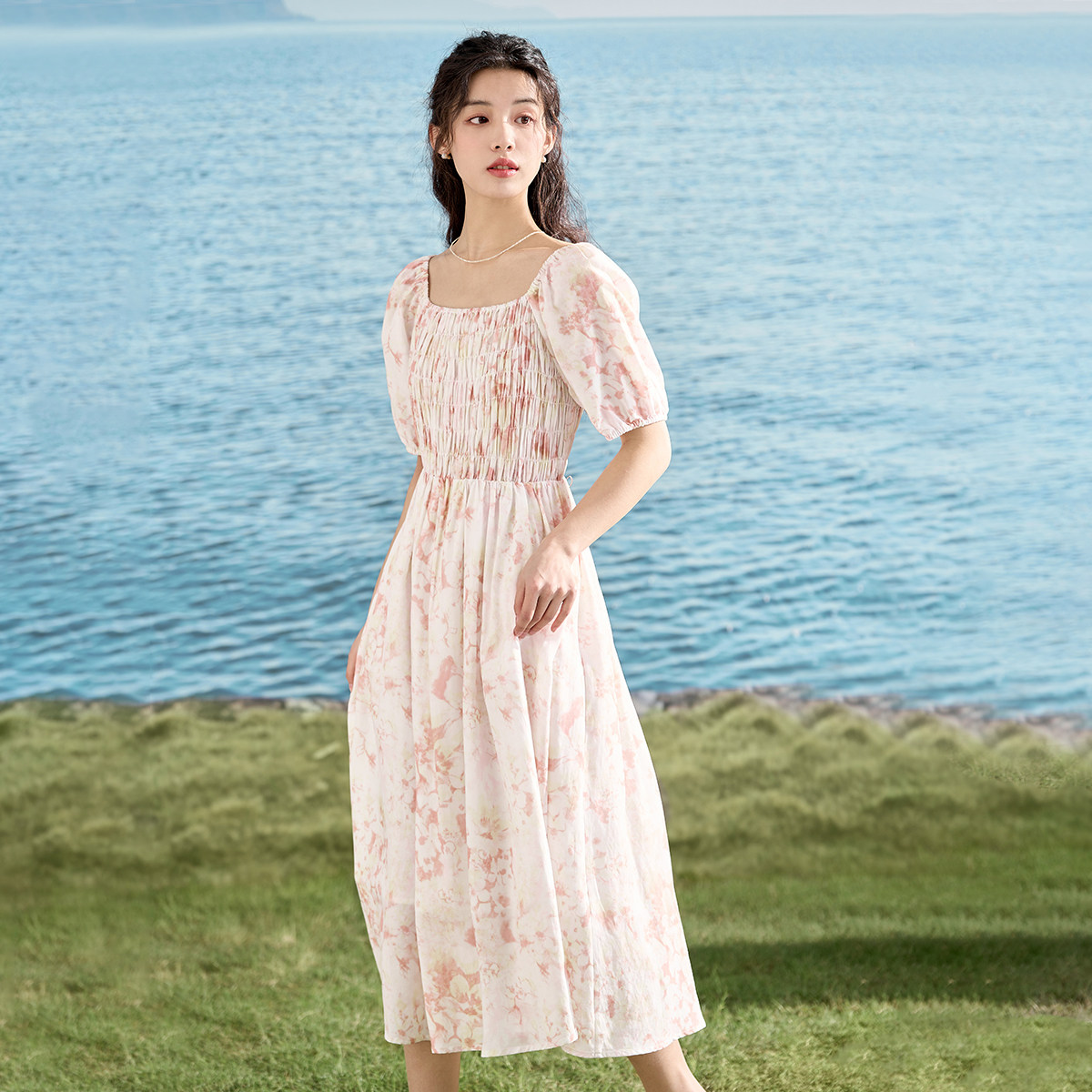 【商场同款】茵曼温柔风连衣裙2023夏女装新款一字肩打揽碎花长裙