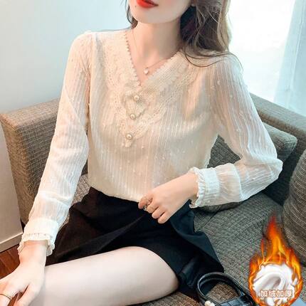 加绒加厚蕾丝衫女秋冬新款V领打底衫时尚内搭上衣气质雪纺衬衫