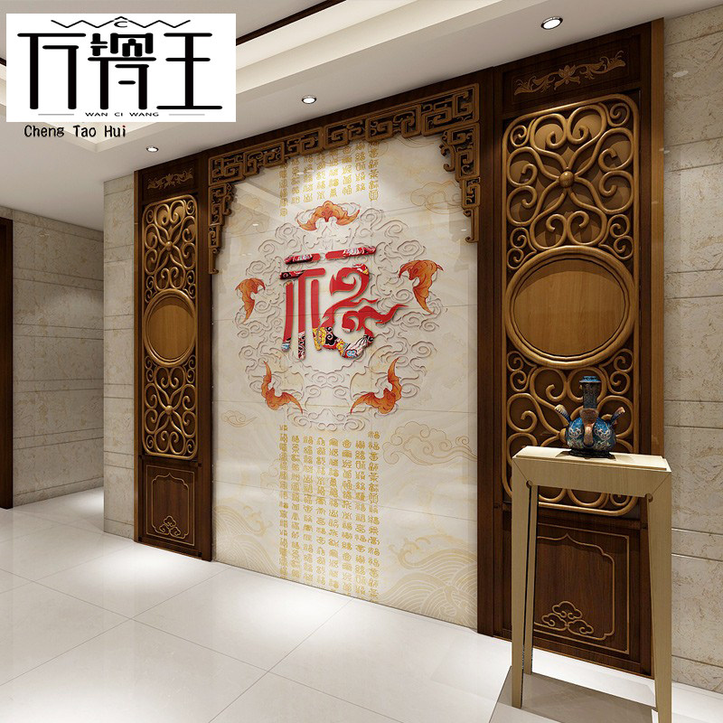 中式玄关瓷砖背景墙五福雕刻镶嵌福字浮雕客厅背景墙壁画 百福图