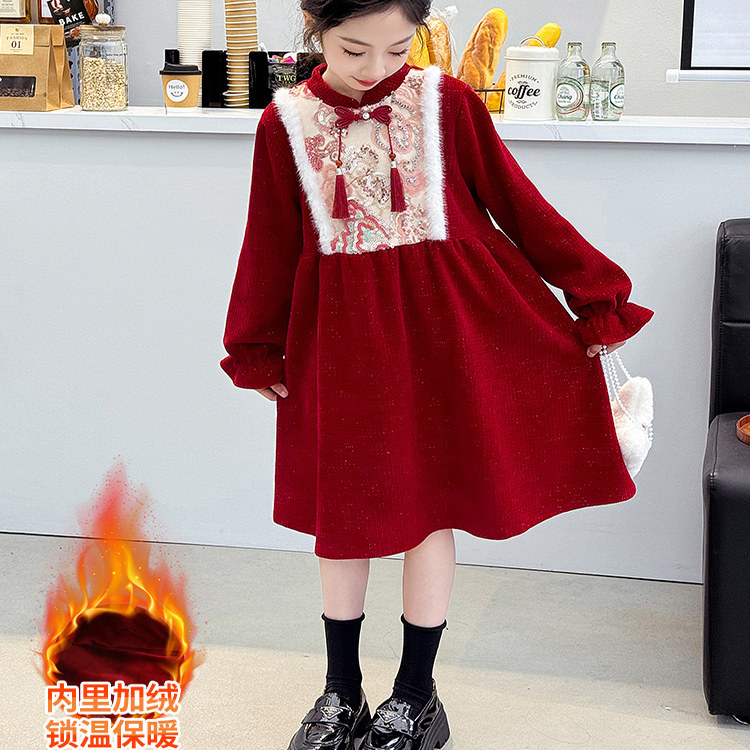 AGLFLIN女童拜年服女大童过年喜庆衣服儿童加绒本命年红色连衣裙