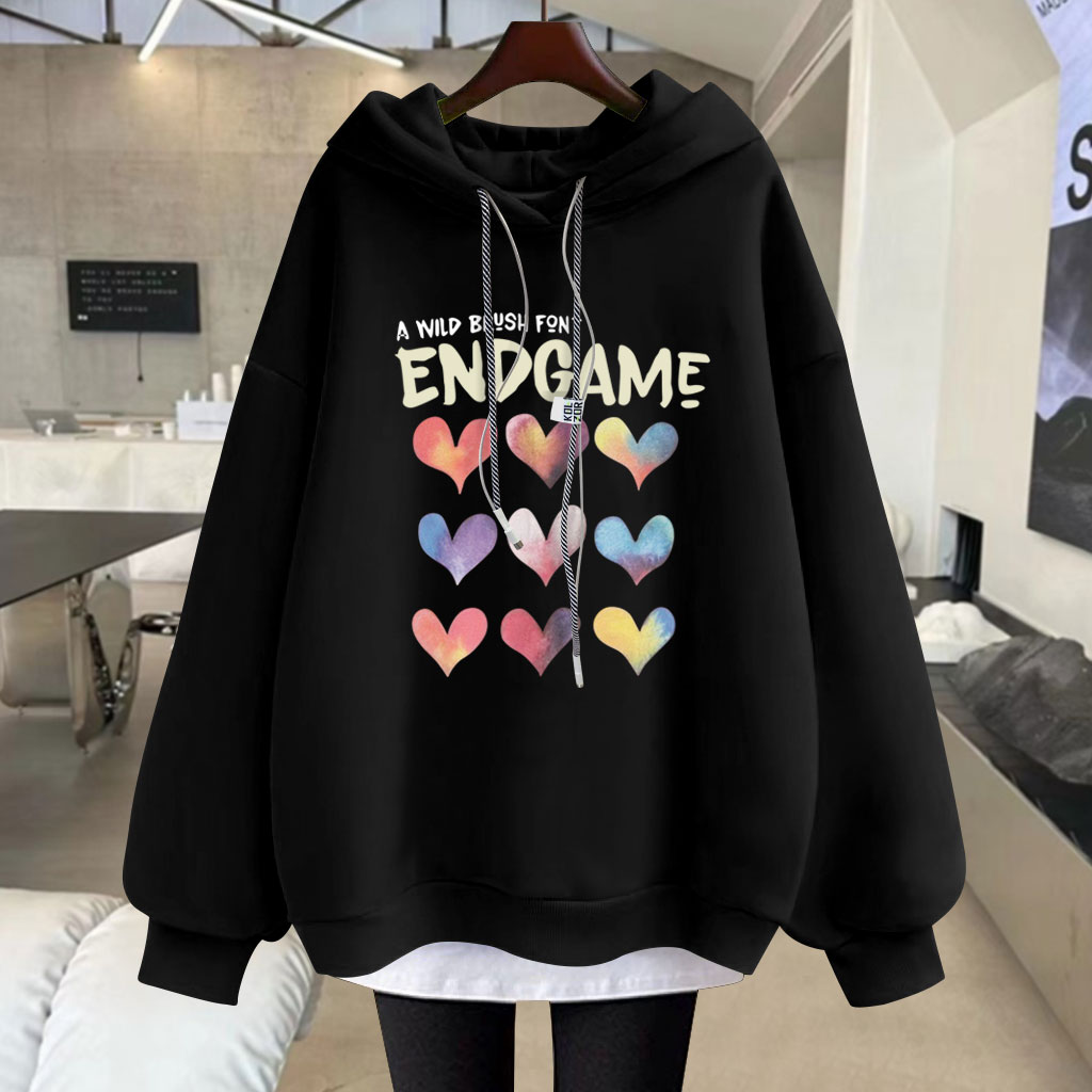 2025春秋冬设计感彩色爱心中长款加绒加厚宽松套头连帽卫衣女潮