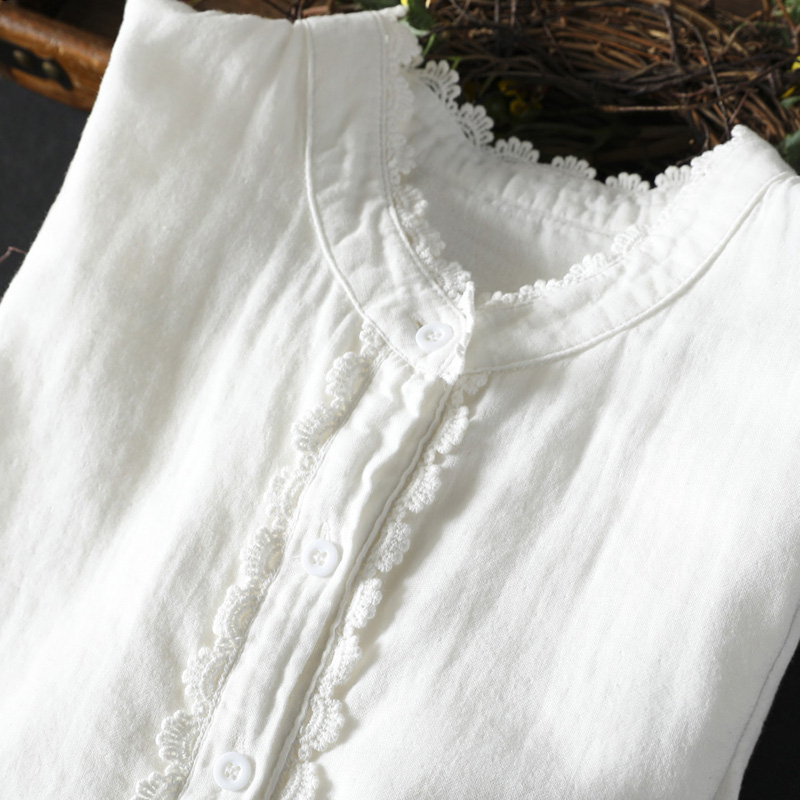 花边立领纯棉长袖衬衫女宽松显瘦2025秋季新款文艺休闲打底衬衣