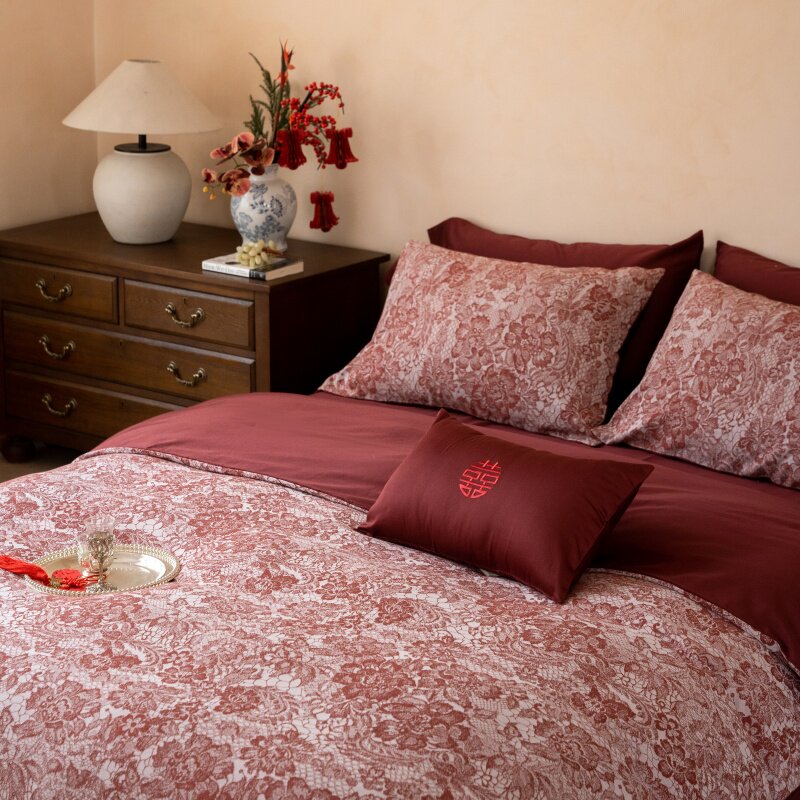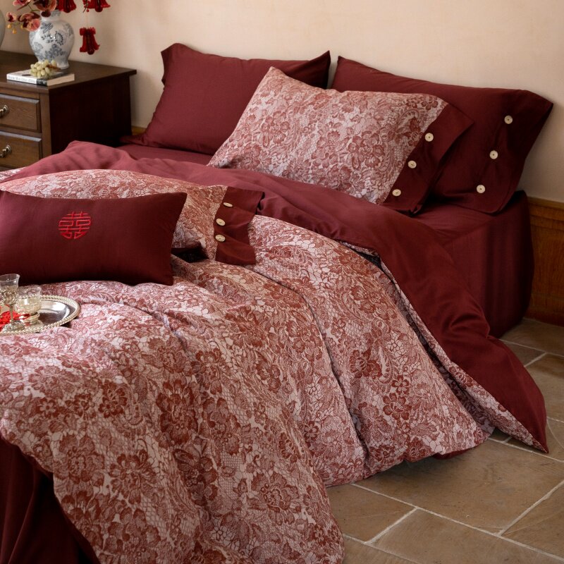 红色婚庆长绒棉提花四件套全棉被套床单结婚亲肤喜庆套件